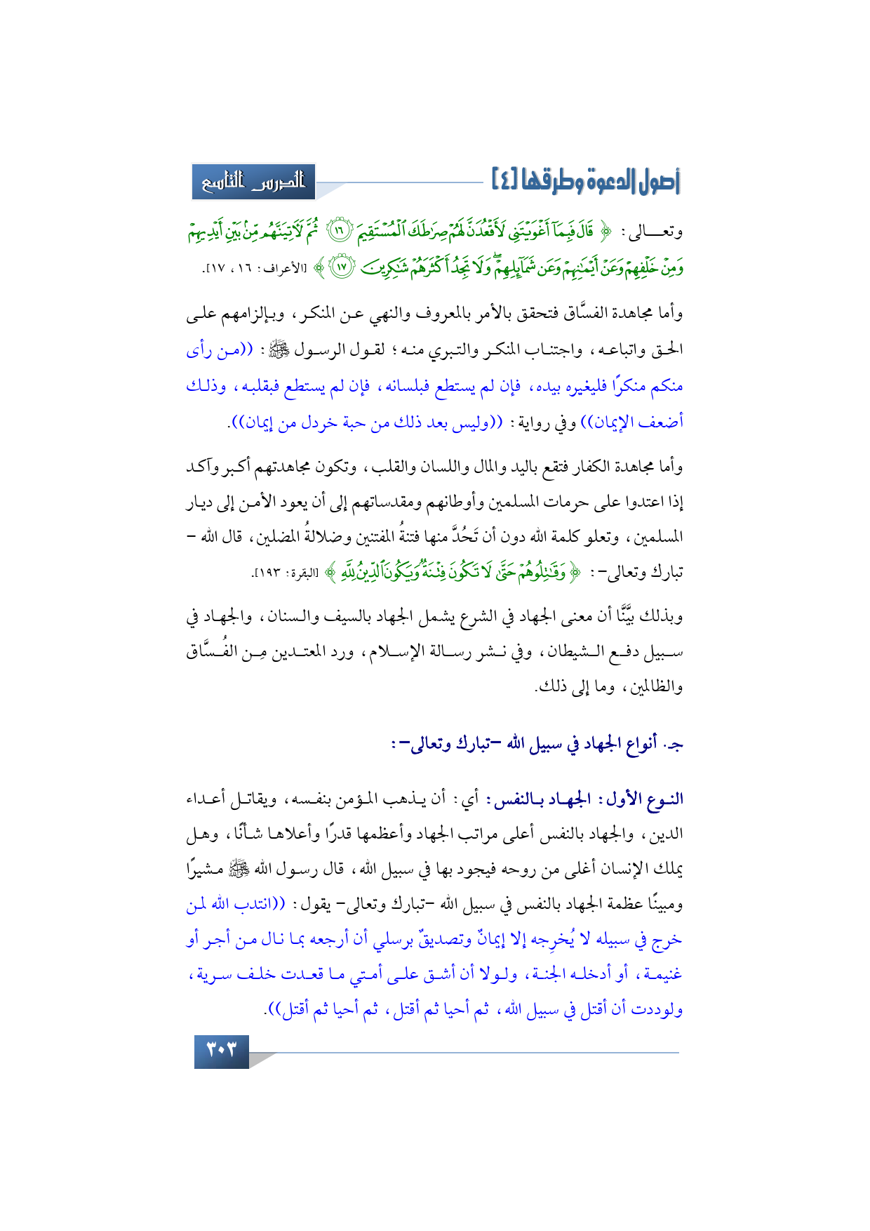 وسيأتي توضيحٌ لذلك أكثر -إن شاء الله تبارك وتعالى- فيما سيأتي بعد، ولكني أردت هنا أن أبين عند تعريفي للجهاد في الشرع أنه يشمل الجهاد بالسيف والسنان، ويشمل أيضًا الجهاد في سبيل دفع الشيطان، وفي نشر رسالة الإسلام، ورد المعتدين من الفساق والظالمين، وما إلى ذلك.