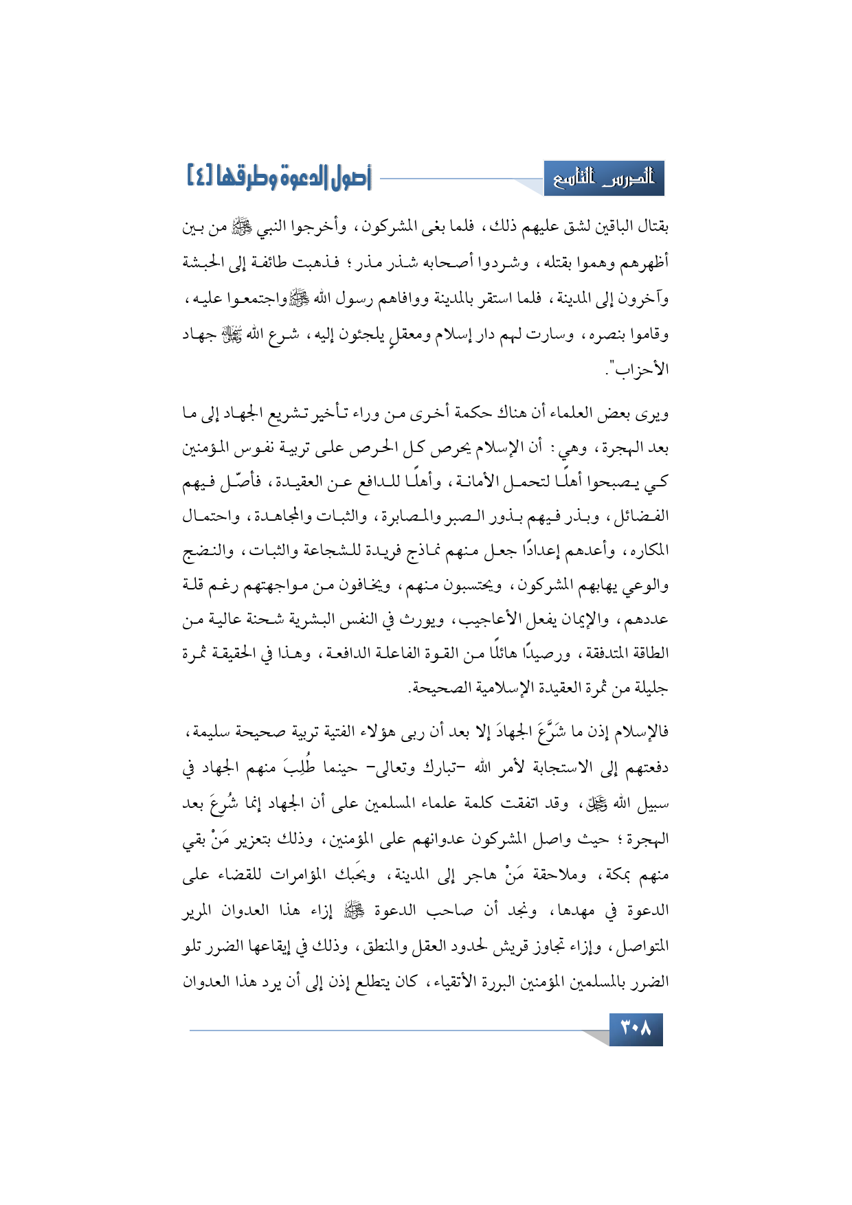 فالإسلام إذن ما شرع الجهاد إلا بعد أن ربى هؤلاء الفتية تربية صحيحة سليمة، دفعتهم إلى الاستجابة لأمر الله -تبارك وتعالى- حينما طُلِبَ منهم الجهاد في سبيل الله -عز وجل- وقد اتفقت كلمة علماء المسلمين على أن الجهاد إنما شُرِعَ بعد الهجرة؛ حيث واصل المشركون عدوانهم على المؤمنين، وذلك بتعزير مَنْ بقي منهم بمكة، وملاحقة مَنْ هاجر إلى المدينة، وبحبك المؤامرات للقضاء على الدعوة في مهدها، ونجد أن صاحب الدعوة -صلى الله عليه وآله وسلم- إزاء هذا العدوان المرير المتواصل، وإزاء تجاوز قريش لحدود العقل والمنطق، وذلك في إيقاعها الضرر تلو الضرر بالمسلمين المؤمنين البررة الأتقياء، كان يتطلع إذن إلى أن يرد هذا العدوان