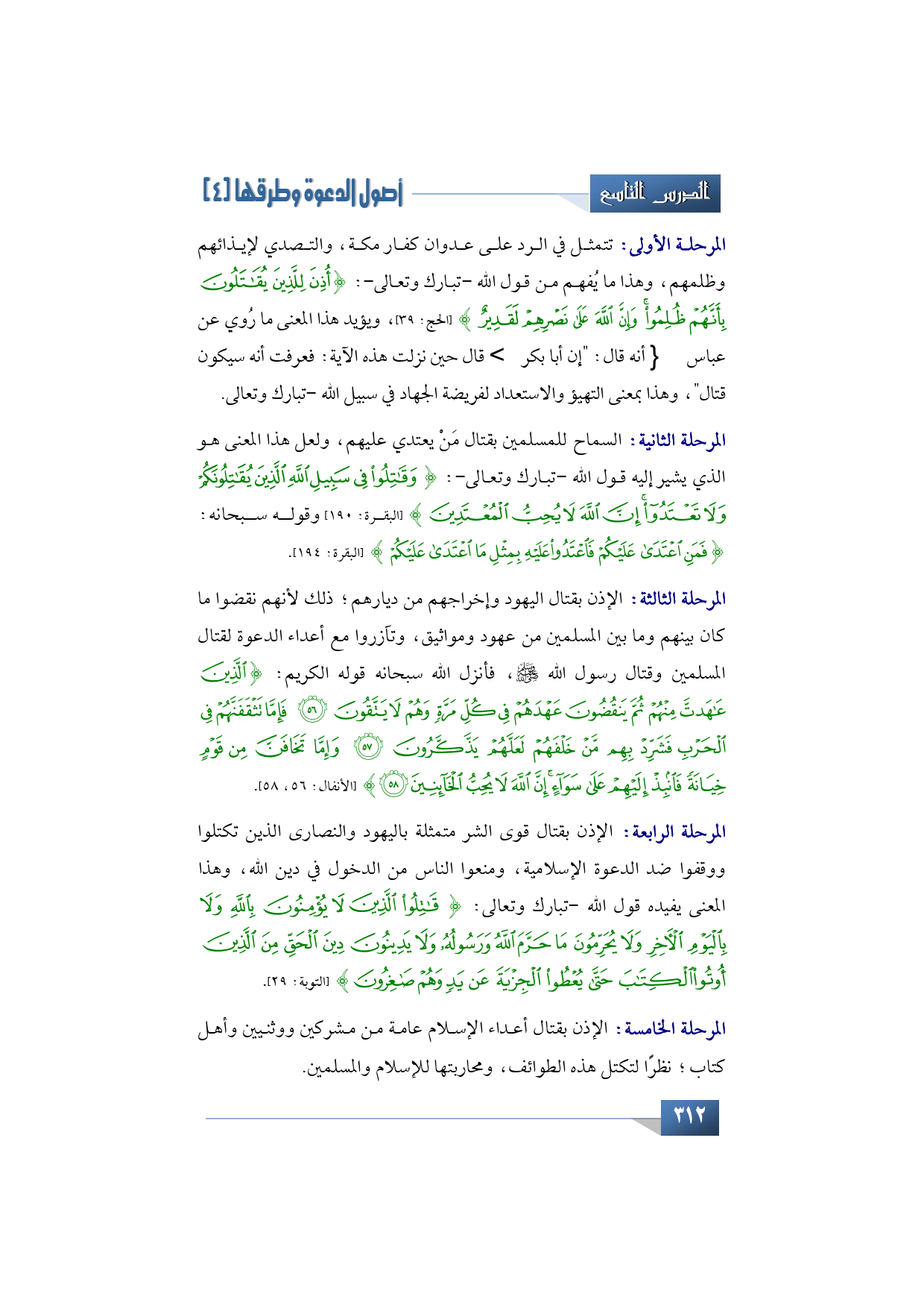 المرحلة الرابعة: الإذن بقتال قوى الشر متمثلة باليهود والنصارى الذين تكتلوا ووقفوا ضد الدعوة الإسلامية، ومنعوا الناس من الدخول في دين الله، وهذا المعنى يفيده قول الله -تبارك وتعالى-: {قَاتِلُوا الَّذِينَ لا يُؤْمِنُونَ بِاللَّهِ وَلا بِالْيَوْمِ الآخِرِ وَلا يُحَرِّمُونَ مَا حَرَّمَ اللَّهُ وَرَسُولُهُ وَلا يَدِينُونَ دِينَ الْحَقِّ مِنَ الَّذِينَ أُوتُوا الْكِتَابَ حَتَّى يُعْطُوا الْجِزْيَةَ عَنْ يَدٍ وَهُمْ صَاغِرُونَ} (التوبة: 29).