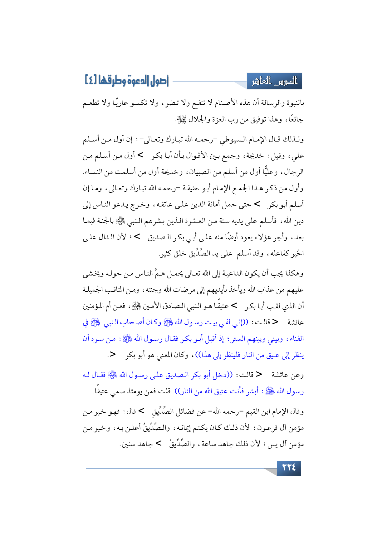 وهكذا يجب أن يكون الداعية إلى الله -تعالى- يحمل هم الناس من حوله ويخشى عليهم من عذاب الله ويأخذ بأيديهم إلى مرضات الله وجنته، ومن المناقب الجميلة أن الذي لقب أبا بكر -رضي الله تعالى عنه- عتيقًا هو النبي الصادق الأمين -صلى الله عليه وآله وسلم- فعن أم المؤمنين عائشة -رضي الله تعالى عنها- قالت: ((إني لفي بيت رسول الله -صلى الله عليه وآله وسلم- وكان أصحاب النبي -عليه الصلاة والسلام- في الفناء، وبيني وبينهم الستر، إذ أقبل أبو بكر فقال رسول الله -صلى الله عليه وآله وسلم-: من سره أن ينظر إلى عتيق من النار فلينظر إلى هذا))، وكان المعني هو أبو بكر -رضي الله تعالى عنه.