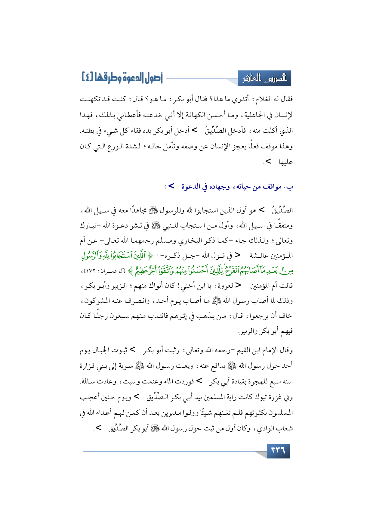 الصديق -رضي الله تعالى عنه- أولًا من الذين استجابوا لله وللرسول -صلى الله عليه وآله وسلم- استجابوا له مجاهدًا في سبيل الله، استجابوا له منفقًا في سبيل الله، استجابوا له في نشر دعوة الله -تبارك وتعالى- ولذلك جاء -كما ذكر البخاري ومسلم رحمهما الله تعالى- عن أم المؤمنين عائشة -رضي الله تعالى عنها- في قول الله -جل ذكره-: {الَّذِينَ اسْتَجَابُوا لِلَّهِ وَالرَّسُولِ مِنْ بَعْدِ مَا أَصَابَهُمُ الْقَرْحُ لِلَّذِينَ أَحْسَنُوا مِنْهُمْ وَاتَّقَوْا أَجْرٌ عَظِيم} (آل عمران: 172) قالت أم المؤمنين -رضي الله عنها- لعروة: يا ابن أختي! كان أبواك منهم؛ الزبير وأبو بكر، وذلك لما أصاب رسول الله -صلى الله عليه وآله وسلم- ما أصاب يوم أحد، وانصرف عنه المشركون، خاف أن يرجعوا، قال: من يذهب في إثرهم فانتدب منهم سبعون رجلًا كان فيهم أبو بكر والزبير.