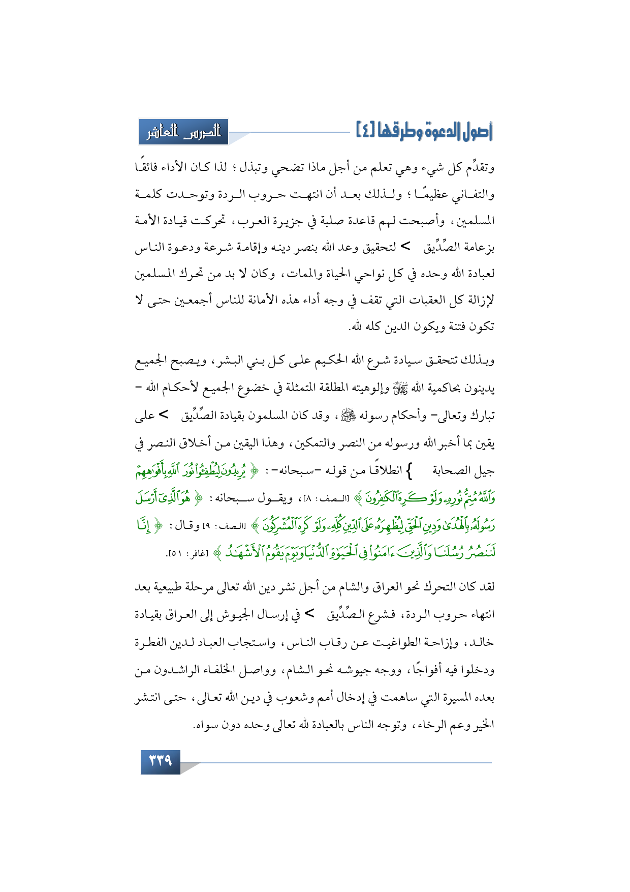 وبذلك تتحقق سيادة شرع الله الحكيم على كل بني البشر، ويصبح الجميع يدينون بحاكمية الله -سبحانه وتعالى- وألوهيته المطلقة المتمثلة في خضوع الجميع لأحكام الله -تبارك وتعالى- وأحكام رسوله -صلى الله عليه وآله وسلم- لقد كان المسلمون بقيادة الصديق -رضي الله عنه- على يقين بما أخبر الله ورسوله من النصر والتمكين، وهذا اليقين من أخلاق النصر في جيل الصحابة -رضي الله تعالى عنهم- انطلاقًا من قوله -سبحانه-: {يُرِيدُونَ لِيُطْفِئُوا نُورَ اللَّهِ بِأَفْوَاهِهِمْ وَاللَّهُ مُتِمُّ نُورِهِ وَلَوْ كَرِهَ الْكَافِرُونَ} (الصف: 8) ويقول -سبحانه-: {هُوَ الَّذِي أَرْسَلَ رَسُولَهُ بِالْهُدَى وَدِينِ الْحَقِّ لِيُظْهِرَهُ عَلَى الدِّينِ كُلِّهِ وَلَوْ كَرِهَ الْمُشْرِكُون} (الصف: 9) وقال -سبحانه-: {إِنَّا لَنَنصُرُ رُسُلَنَا وَالَّذِينَ آمَنُوا فِي الْحَيَاةِ الدُّنْيَا وَيَوْمَ يَقُومُ الأَشْهَاد} (غافر: 51).