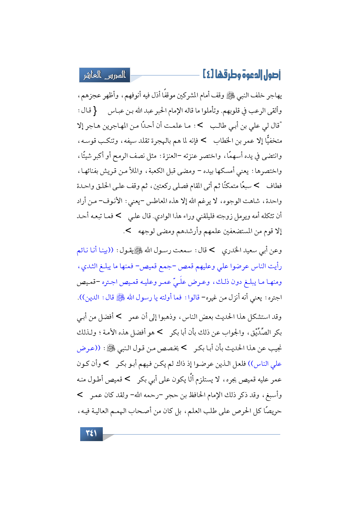 وعن أبي سعيد الخدري -رضي الله تعالى عنه- قال: سمعت رسول الله -صلى الله عليه وآله وسلم- يقول: ((بينا أنا نائم رأيت الناس عرضوا علي وعليهم قمص -جمع قميص- فمنها ما يبلغ الثدي، ومنها ما يبلغ دون ذلك، وعرض علَيّ عمر وعليه قميص اجتره -قميص اجتره: يعني أنه أنزل من غيره- قالوا: فما أولته يا رسول الله -صلى الله عليه وآله وسلم- قال: الدين)).