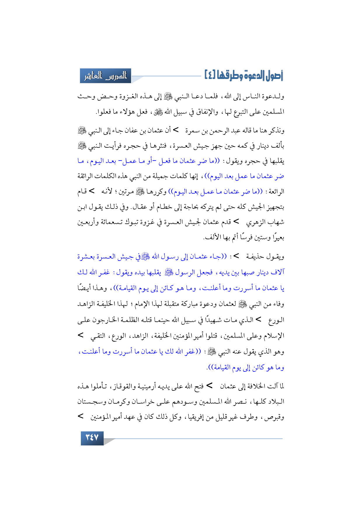 ولدعوة الناس إلى الله، كل هؤلاء لما دعا النبي -صلى الله عليه وآله وسلم- إلى هذه الغزوة وحض وحث المسلمين على التبرع لها، والإنفاق في سبيل الله -عز وجل- فعل هؤلاء ما فعلوا، أما والحديث عن عثمان -رضي الله عنه- فأذكر هنا ما قاله عبد الرحمن بن سمرة -رضي الله عنه- أن عثمان بن عفان جاء إلى النبي -صلى الله عليه وآله وسلم- بألف دينار في كمه حين جهز جيش العسرة، فنثرها في حجره فرأيت النبي -صلى الله عليه وآله وسلم- يقلبها في حجره ويقول: ((ما ضر عثمان ما فعل -أو ما عمل- بعد اليوم، ما ضر عثمان ما عمل بعد اليوم))، إنها كلمات جميلة من النبي -صلى الله عليه وآله وسلم- تبين مدى فرحة النبي -عليه الصلاة والسلام- بهؤلاء الرجال الأطهار الأبرار.
