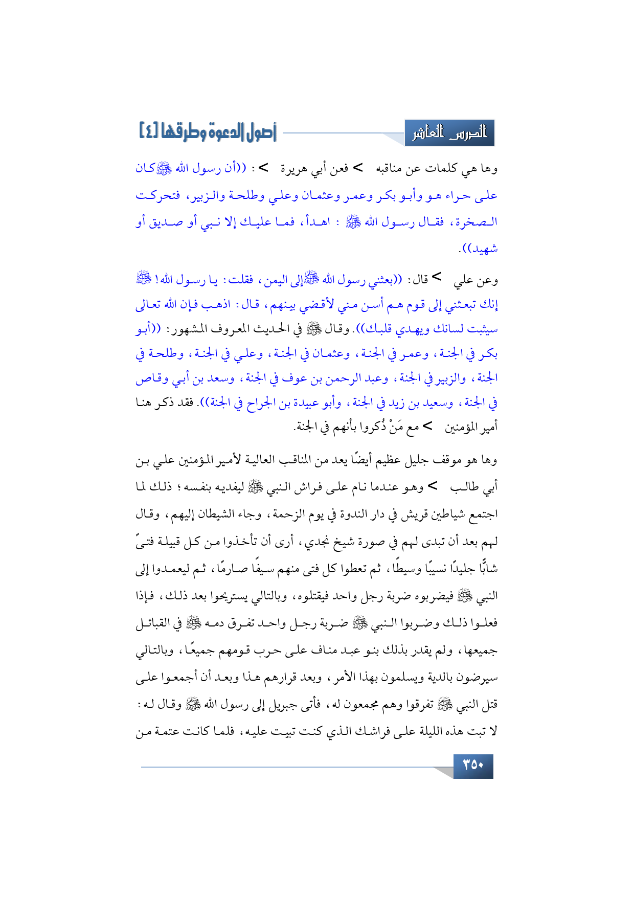 وعن علي -رضي الله عنه- قال: ((بعثني رسول الله -صلى الله عليه وآله وسلم- إلى اليمن، فقلت: يا رسول الله! -صلى الله عليه وآله وسلم- إنك تبعثني إلى قوم هم أسن مني لأقضي بينهم، قال: اذهب فإن الله تعالى سيثبت لسانك ويهدي قلبك)). وقال -صلى الله عليه وآله وسلم- في الحديث المعروف المشهور: ((أبو بكر في الجنة، وعمر في الجنة، وعثمان في الجنة، وعلي في الجنة، وطلحة في الجنة، والزبير في الجنة، وعبد الرحمن بن عوف في الجنة، وسعد بن أبي وقاص في الجنة، وسعيد بن زيد في الجنة، وأبو عبيدة بن الجراح في الجنة)). فقد ذكر هنا أمير المؤمنين -رضي الله عنه- مع من ذكروا بأنهم في الجنة.