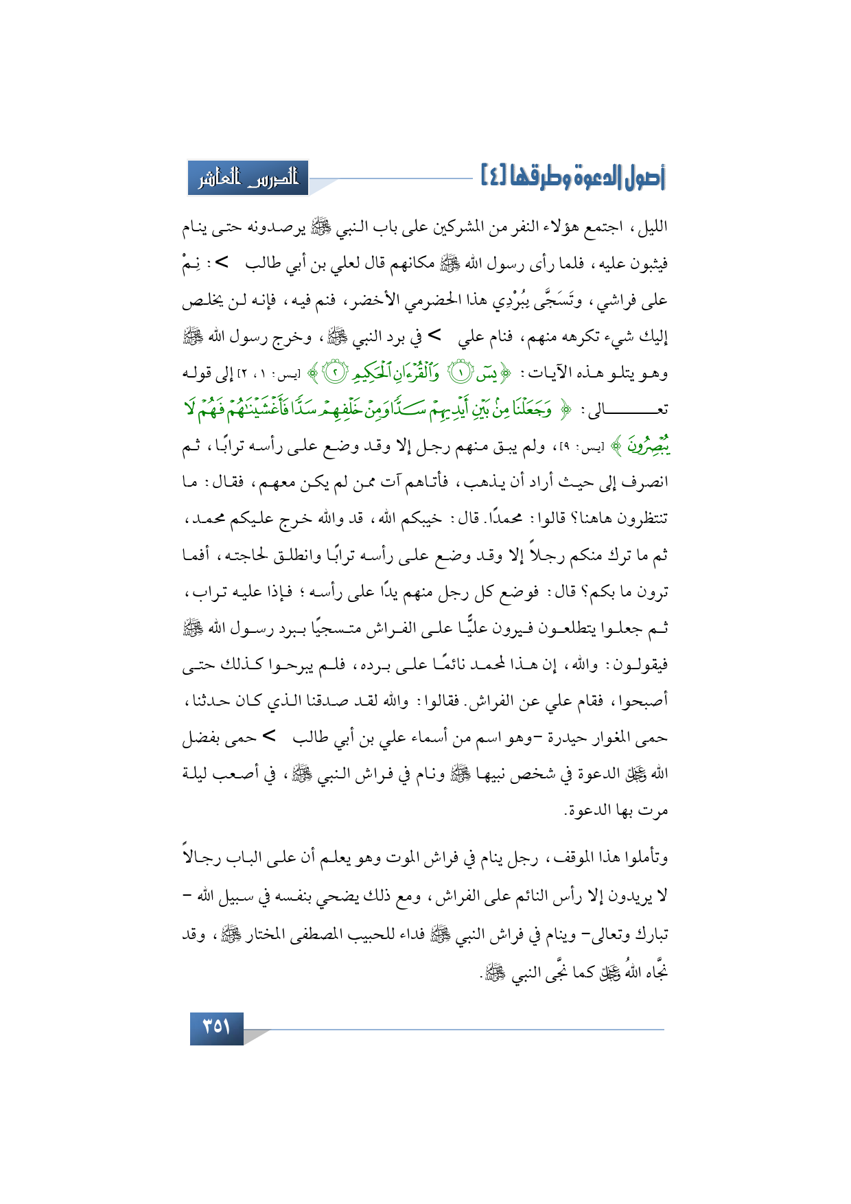 الليل، اجتمع هؤلاء النفر من المشركين على باب النبي -صلى الله عليه وآله وسلم- يرصدونه حتى ينام فيثبون عليه، فلما رأى رسول الله -صلى الله عليه وآله وسلم- مكانهم قال لعلي بن أبي طالب -رضي الله عنه- نم على فراشي، وتسجى ببردي هذا الحضرمي الأخضر، فنم فيه، فإنه لن يخلص إليك شيء تكرهه منهم، وكان رسول الله -صلى الله عليه وآله وسلم- ينام في برده ذلك إذ ينام، ثم خرج رسول الله -صلى الله عليه وآله وسلم- وهو يتلو هذه الآيات: {يس وَالْقُرْآنِ الْحَكِيمِ ... } (يس: 1، 2) إلى قوله تعالى: {وَجَعَلْنَا مِنْ بَيْنِ أَيْدِيهِمْ سَدًّا وَمِنْ خَلْفِهِمْ سَدًّا فَأَغْشَيْنَاهُمْ فَهُمْ لا يُبْصِرُونَ} (يس: 9) ولم يبق منهم رجل إلا وقد وضع على رأسه ترابًا، ثم انصرف إلى حيث أراد أن يذهب، فأتاهم آت ممن لم يكن معهم، فقال: ما تنتظرون هاهنا؟ قالوا: محمدًا. قال: خيبكم الله، قد والله خرج عليكم محمد، ثم ما ترك منكم رجلاً إلا وقد وضع على رأسه ترابًا وانطلق لحاجته، أفما ترون ما بكم؟ قال: فوضع كل رجل منهم يدًا على رأسه؛ فإذا عليه تراب، ثم جعلوا يتطلعون فيرون عليًّا على الفراش متسجيًا ببرد رسول الله -صلى الله عليه وآله وسلم- فيقولون: والله، إن هذا لمحمد نائمًا على برده، فلم يبرحوا كذلك حتى أصبحوا، فقام علي عن الفراش. فقالوا: والله لقد صدقنا الذي كان حدثنا، حمى المغوار حيدرة -وهو اسم من أسماء علي بن أبي طالب -رضي الله عنه- حمى بفضل الله -عز وجل- الدعوة في شخص نبيها -صلى الله عليه وآله وسلم- ونام على فراشه، وفي فراشه، في أصعب ليلة مرت بها الدعوة.