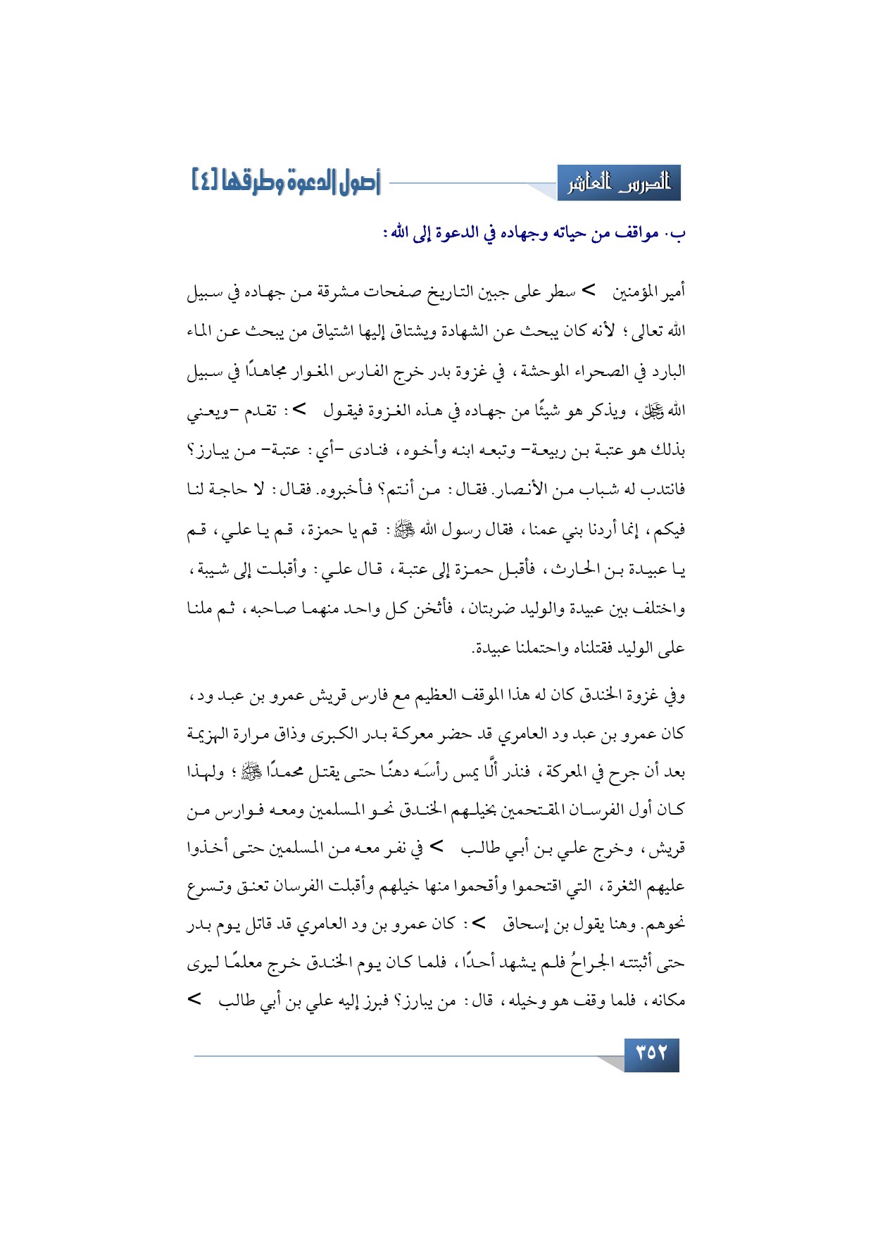 أمير المؤمنين -رضي الله تعالى عنه- سطر على جبين التاريخ صفحات مشرقة من جهاده في سبيل الله تعالى؛ لأنه كان يبحث عن الشهادة ويشتاق إليها اشتياق من يبحث عن الماء البارد في الصحراء الموحشة، في غزوة بدر خرج الفارس المغوار مجاهدًا في سبيل الله -عز وجل- ويذكر هو شيئًا من جهاده في هذه الغزوة فيقول -رضي الله عنه-: تقدم -ويعني بذلك هو عتبة بن ربيعة- وتبعه ابنه وأخوه، فنادى -يعني عتبة- من يبارز؟ فانتدب له شباب من الأنصار. فقال: من أنتم؟ فأخبروه. فقال: لا حاجة لنا فيكم، إنما أردنا بني عمنا، فقال رسول الله -صلى الله عليه وآله وسلم-: قم يا حمزة، قم يا علي، قم يا عبيدة بن الحارث، فأقبل حمزة إلى عتبة، قال علي: وأقبلت إلى شيبة، واختلف بين عبيدة والوليد ضربتان، فأثخن كل واحد منهما صاحبه، ثم ملنا على الوليد فقتلناه واحتملنا عبيدة.