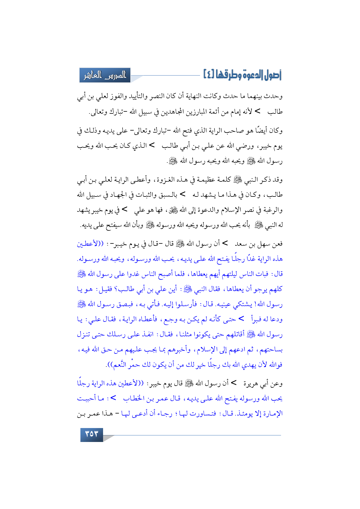 فعن سهل بن سعد -رضي الله عنه- أن رسول الله -صلى الله عليه وآله وسلم- قال -قال في يوم خيبر-: ((لأعطين هذه الراية غدًا رجلاً يفتح الله على يديه، يحب الله ورسوله، ويحبه الله ورسوله. قال: فبات الناس ليلتهم أيهم يعطاها، فلما أصبح الناس غدوا على رسول الله -صلى الله عليه وآله وسلم- كلهم يرجو أن يعطاها، فقال النبي -صلى الله عليه وآله وسلم-: أين علي بن أبي طالب؟ فقيل: هو يا رسول الله! يشتكي عينيه. قال: فأرسلوا إليه. فأتي به، فبصق رسول الله -صلى الله عليه وآله وسلم- ودعا له فبرأ -رضي الله عنه- حتى كأنه لم يكن به وجع، فأعطاه الراية، فقال علي: يا رسول الله -صلى الله عليه وآله وسلم- أقاتلهم حتى يكونوا مثلنا، فقال: انفذ على رسلك حتى تنزل بساحتهم، ثم ادعهم إلى الإسلام، وأخبرهم بما يجب عليهم من حق الله فيه، فوالله لأن يهدي الله بك رجلًا خير لك من أن يكون لك حمْر النَّعم)).