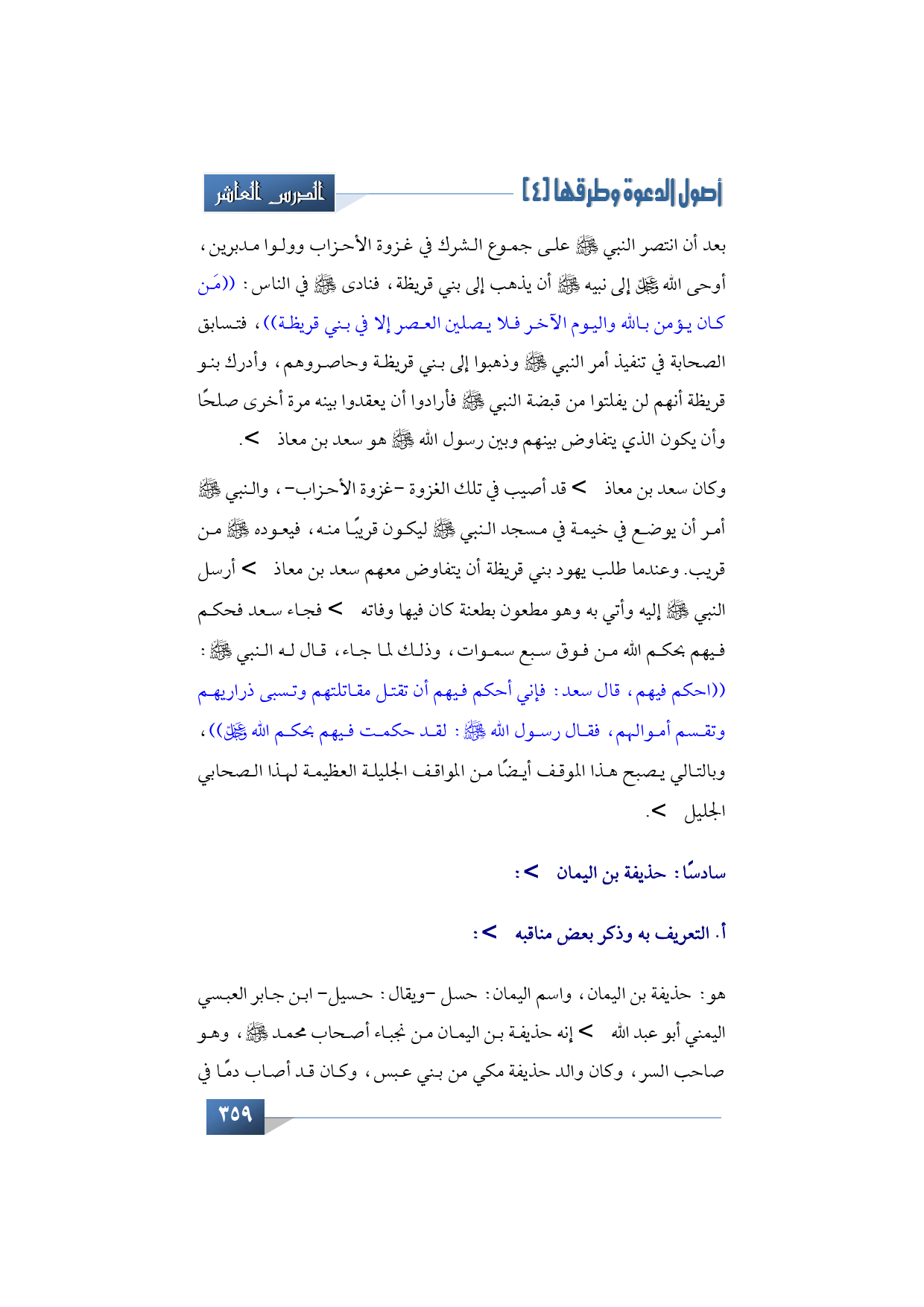 سعد بن معاذ -رضي الله عنه- قد أصيب في هذه الغزوة في غزوة الأحزاب، والنبي -صلى الله عليه وآله وسلم- أمر أن يوضع في خيمة في مسجد النبي -صلى الله عليه وآله وسلم- ليكون قريبًا منه، فيعوده -عليه الصلاة والسلام- من قريب. طلب اليهود، يهود بني قريظة أن يتفاوض معهم سعد بن معاذ -رضي الله تعالى عنه- فأرسل النبي -صلى الله عليه وآله وسلم- إلى سعد بن معاذ وبعث إليه، وأتي به وهو مطعون -رضي الله تعالى عنه- بطعنة جاءت فيه كان فيها وفاته -رضي الله تعالى عنه- أتي بسعد فحكم فيهم بحكم الله من فوق سبع سنوات، وذلك لما جاء، قال له النبي -صلى الله عليه وآله وسلم-: ((احكم فيهم، قال سعد: فإني أحكم فيهم أن تقتل مقاتلتهم وتسبى ذراريهم وتقسم أموالهم، فقال رسول الله -صلى الله عليه وآله وسلم-: لقد حكمت فيهم بحكم الله -عز وجل)) وبالتالي يصبح هذا الموقف أيضًا من المواقف الجليلة العظيمة لهذا الصحابي الجليل -رضي الله تعالى عنه.