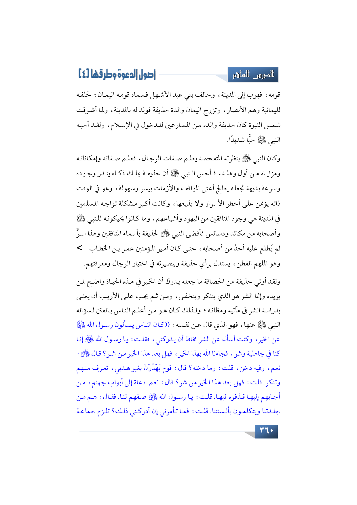 ولقد أوتي حذيفة من الحصافة ما جعله يدرك أن الخير في هذه الحياة واضح لمن يريده وإنما الشر هو الذي يتنكر ويتخفى، ومن ثم يجب على الأريب أن يعنى بدراسة الشر في مآتيه ومظانه، ولذلك كان هو من أعلم الناس بالفتن لسؤاله النبي -صلى الله عليه وآله وسلم- عنها، فهو الذي قال عن نفسه: ((كان الناس يسألون رسول الله -صلى الله عليه وآله وسلم- عن الخير، وكنت أسأله عن الشر مخافة أن يدركني، فقلت: يا رسول الله -صلى الله عليه وآله وسلم- إنا كنا في جاهلية وشر فجاءنا الله بهذا الخير، فهل بعد هذا الخير من شر؟ قال: نعم. قلت: وهل بعد الشر من خير؟ قال: نعم. وفيه دخن، قلت: وما دخنه؟ قال: قوم يهدون بغير هديي تعرف منهم وتنكر. قلت: فهل بعد هذا الخير من شر؟ قال: نعم. دعاة إلى أبواب جهنم، من أجابهم إليها قذفوه فيها. قلت: يا رسول الله -صلى الله عليه وآله وسلم- صفهم لنا. فقال: هم من جلدتنا ويتكلمون بألسنتنا. قلت: فما تأمرني إن أدركني ذلك؟ تلزم جماعة