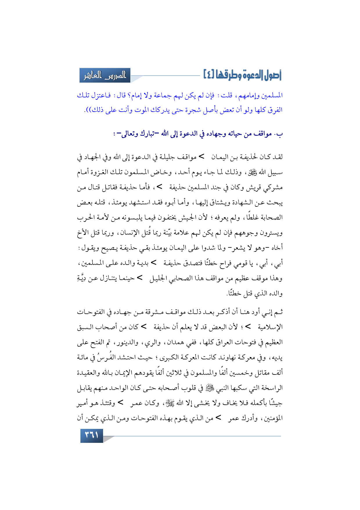 لقد كان لحذيفة بن اليمان -رضي الله تعالى عنه- مواقف جليلة في الدعوة إلى الله وفي الجهاد في سبيل الله -عز وجل- وذلك لما جاء يوم أحد، وخاض المسلمون تلك الغزوة أمام مشركي قريش وكان في جند المسلمين حذيفة -رضي الله تعالى عنه- فأما حذيفة فقاتل قتال من يبحث عن الشهادة ويشتاق إليها، وأما أبوه فقد استشهد يومئذ، قتله بعض الصحابة غلطًا، ولم يعرفه؛ لأن الجيش يختفون فيما يلبسونه من لأمة الحرب ويسترون وجوههم فإن لم يكن لهم علامة بيّنة ربما قُتل الإنسان، وربما قتل الأخ أخاه -وهو لا يشعر- ولما شدوا على اليمان يومئذ بقي حذيفة يصيح ويقول: أبي، أبي، يا قومي فراح خطئًا فتصدق حذيفة -رضي الله تعالى عنه- بدية والده على المسلمين، وهذا موقف عظيم من مواقف هذا الصحابي الجليل -رضي الله تعالى عنه- حينما يتنازل عن دية والده الذي قتل خطئًا.