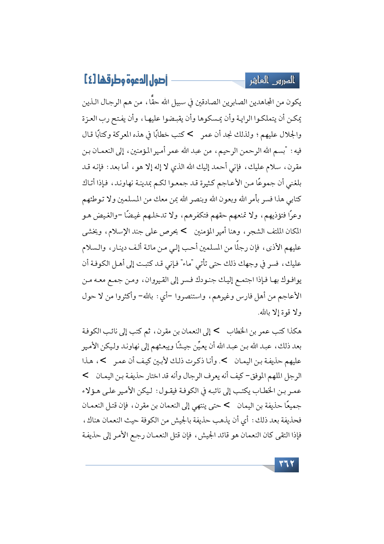 يكون من المجاهدين الصابرين الصادقين في سبيل الله حقًّا، من هم الرجال الذين يمكن أن يتملكوا الراية وأن يمسكوها وأن يقبضوا عليها، وأن يفتح رب العزة والجلال -سبحانه وتعالى- عليهم؛ ولذلك نجد أن عمر -رضي الله عنه- كتب خطابًا في هذه المعركة وكتابًا قال فيه: "بسم الله الرحمن الرحيم، من عبد الله عمر أمير المؤمنين، إلى النعمان بن مقرن، سلام عليك -أنا أذكر هذا الخطاب لأبين للمستمعين الكرام ماذا كان يعلم عن حذيفة -رضي الله عنه- وماذا فعل حذيفة -رضي الله تعالى عنه- وفيما أذكر إشارة لامعة واضحة إلى جهاد هؤلاء الصحب الكرام جميعًا في سبيل الله -تبارك وتعالى- وأنهم -رضوان الله تعالى عليهم- بذلوا كل ما يملكون في سبيل نشر الإسلام، والدعوة إليه وفي سبيل إسعاد الناس بنطقهم بلا إله إلا الله محمد رسول الله صلى الله عليه وآله وسلم- كتب عمر إلى النعمان بن مقرن: سلام عليك، فإني أحمد إليك الله الذي لا إله إلا هو، أما بعد: فإنه قد بلغني أن جموعًا من الأعاجم كثيرة قد جمعوا لكم بمدينة نهاوند، فإذا أتاك كتابي هذا فسر بأمر الله وبعون الله وبنصر الله بمن معك من المسلمين ولا توطئهم وعرًا فتؤذيهم، ولا تمنعهم حقهم فتكفرهم، ولا تدخلهم غيضًا -والغيض هو المكان الملتف الشجر، وهنا أمير المؤمنين -رضي الله عنه- يحرص على جند الإسلام، ويسعى في أن يحتفظ بهؤلاء الرجال الأبرار، ولا يود -رضي الله تعالى عنه- أن يهلكوا أو أن يكونوا في مكان يمكن أن يصابوا فيه بأذى، وهذا من حب أمير المؤمنين -رضي الله تعالى عنه- للإسلام، ولله ولرسول الله -صلى الله عليه وآله وسلم- ولدين الله -عز وجل- وحبه أيضًا لمن دخل في هذا الدين، وتأملوا قول أمير المؤمنين بعد ذلك- فإن رجلًا من المسلمين أحب إلي من مائة ألف دينار والسلام عليك، فسر في وجهك ذلك حتى تأتي "ماء" فإني قد كتبت إلى أهل الكوفة أن يوافوك بها -مكان هناك- فإذا اجتمع إليك جنودك فسر إلى القيروان، ومن جمع معه من الأعاجم من أهل فارس وغيرهم، واستنصروا -استنصروا يعني بالله- وأكثروا من لا حول ولا قوة إلا بالله.