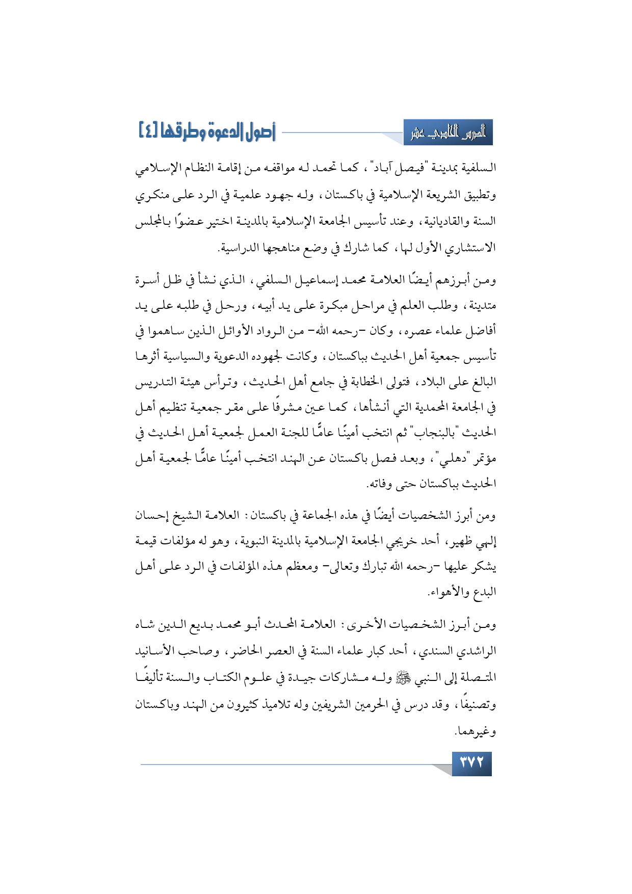 ومن أبرز الشخصيات أيضًا في هذه الجماعة في باكستان: العلامة الشيخ إحسان إلهي ظهير، أحد خريجي الجامعة الإسلامية بالمدينة النبوية، وهو له مؤلفات قيمة يشكر عليها -رحمه الله تبارك وتعالى- ومعظم هذه المؤلفات في الرد على أهل البدع والأهواء.