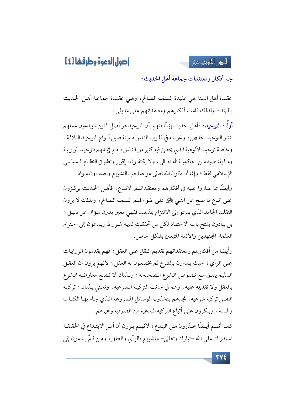 جـ- أفكار ومعتقدات جماعة أهل الحديث: