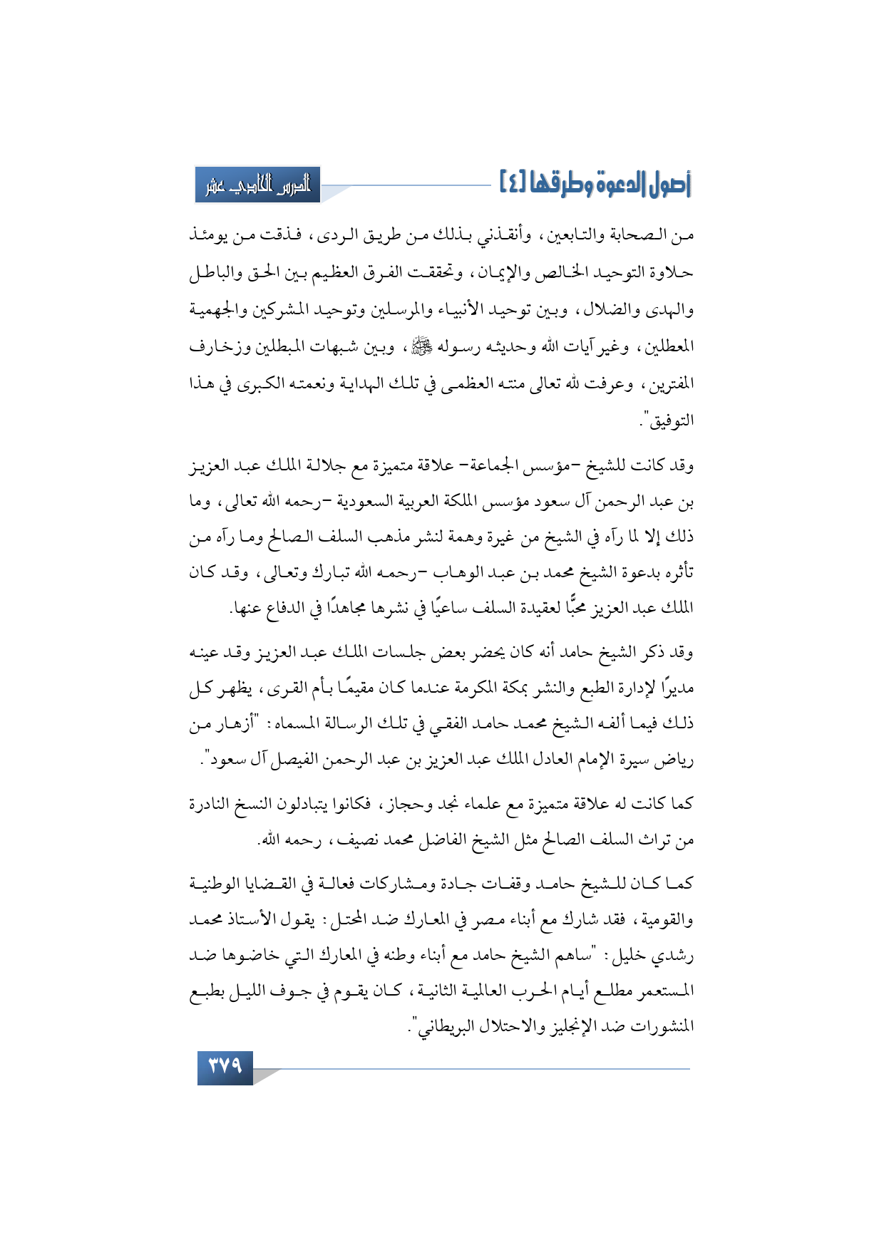 وقد كانت للشيخ -مؤسس الجماعة- علاقة متميزة مع جلالة الملك عبد العزيز بن عبد الرحمن آل سعود مؤسس الملكة العربية السعودية -رحمه الله تعالى- وما ذلك إلا لما رآه في الشيخ من غيرة وهمة لنشر مذهب السلف الصالح وما رآه من تأثره بدعوة الشيخ محمد بن عبد الوهاب -رحمه الله تبارك وتعالى- وقد كان الملك عبد العزيز محبًّا لعقيدة السلف ساعيًا في نشرها مجاهدًا في الدفاع عنها.