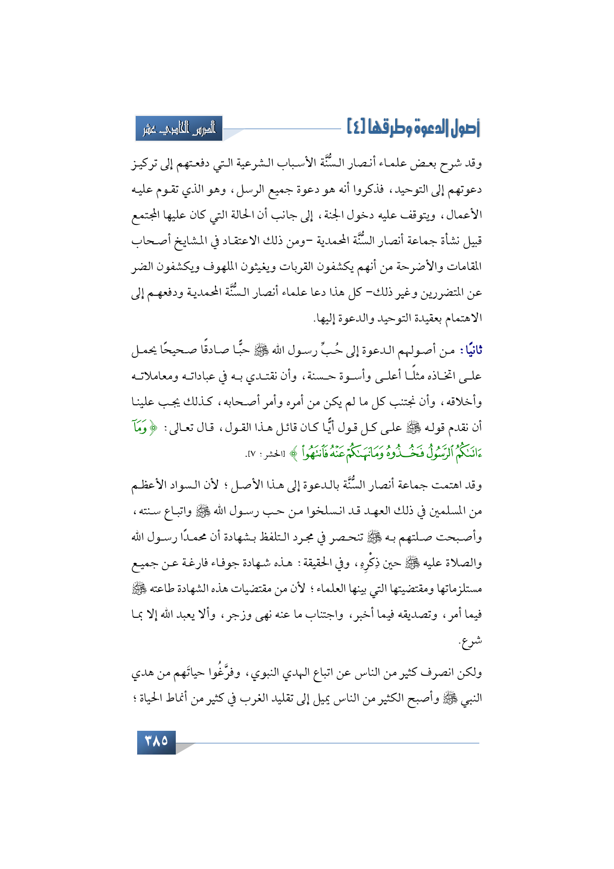 ثانيًا: من أصولهم الدعوة إلى حب رسول الله -صلى الله عليه وآله وسلم- حبًّا صادقًا صحيحًا يحمل على اتخاذه مثلًا أعلى وأسوة حسنة، وأن نقتدي به في عباداته ومعاملاته وأخلاقه وأن نجتنب كل ما لم يكن من أمره وأمر أصحابه، كذلك يجب علينا أن نقدم قوله -صلى الله عليه وآله وسلم- على كل قول أيًّا كان قائل هذا القول قال تعالى: {وَمَا آتَاكُمُ الرَّسُولُ فَخُذُوهُ وَمَا نَهَاكُمْ عَنْهُ فَانْتَهُوا} (الحشر: 7).