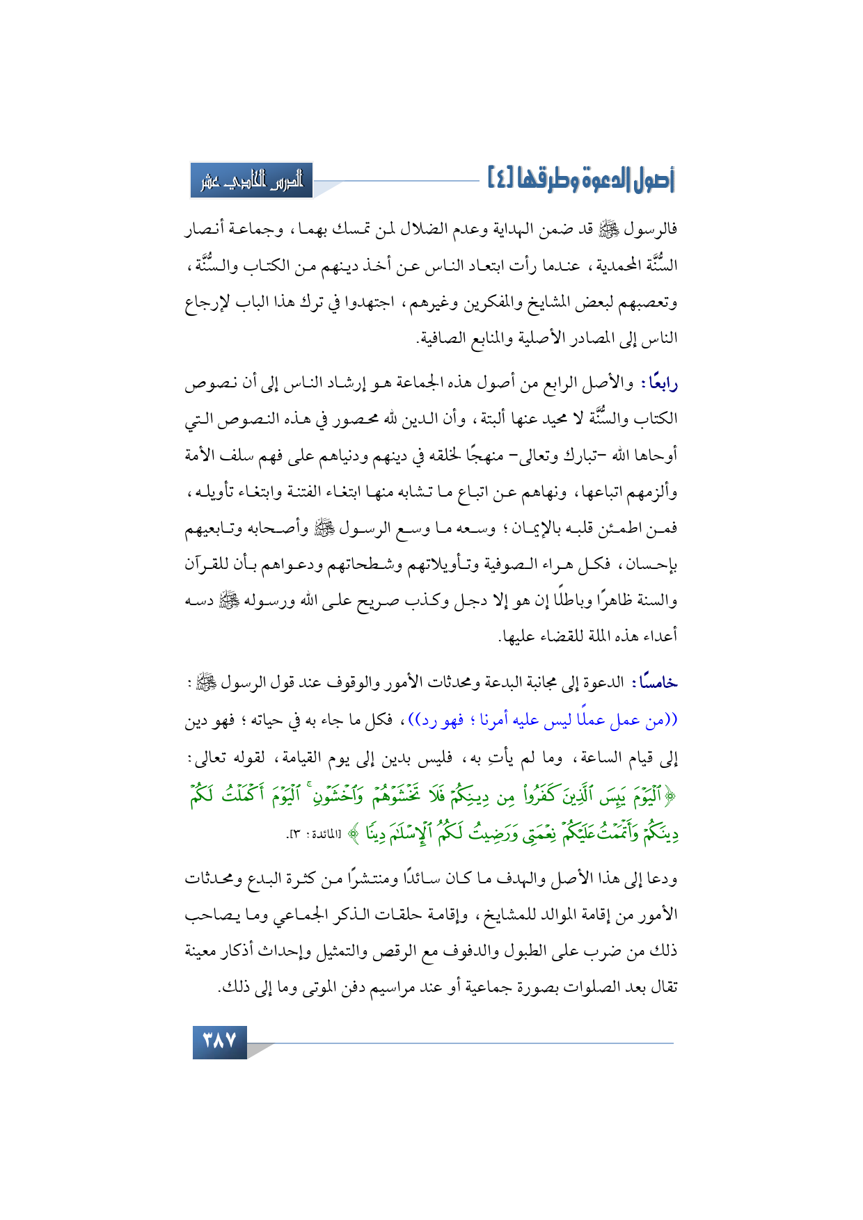 الأصل الرابع من أصول هذه الجماعة: إرشاد الناس إلى أن نصوص الكتاب والسنة لا محيد عنها ألبتة، وأن الدين لله محصور في هذه النصوص التي أوحاها الله -تبارك وتعالى- منهجًا لخلقه في دينهم ودنياهم على فهم سلف الأمة وألزمهم اتباعها، ونهاهم عن إتباع ما تشابه منها ابتغاء الفتنة وابتغاء تأويله، فمن اطمئن قلبه بالإيمان؛ وسعه ما وسع الرسول -صلى الله عليه وآله وسلم- وأصحابه وتابعيهم بإحسان، فكل هراء الصوفية وتأويلاتهم وشطحاتهم ودعواهم بأن للقرآن والسنة ظاهرًا وباطلًا إن هو إلا دجل وكذب صريح على الله ورسوله -صلى الله عليه وآله وسلم- دسه أعداء هذه الملة للقضاء عليها.