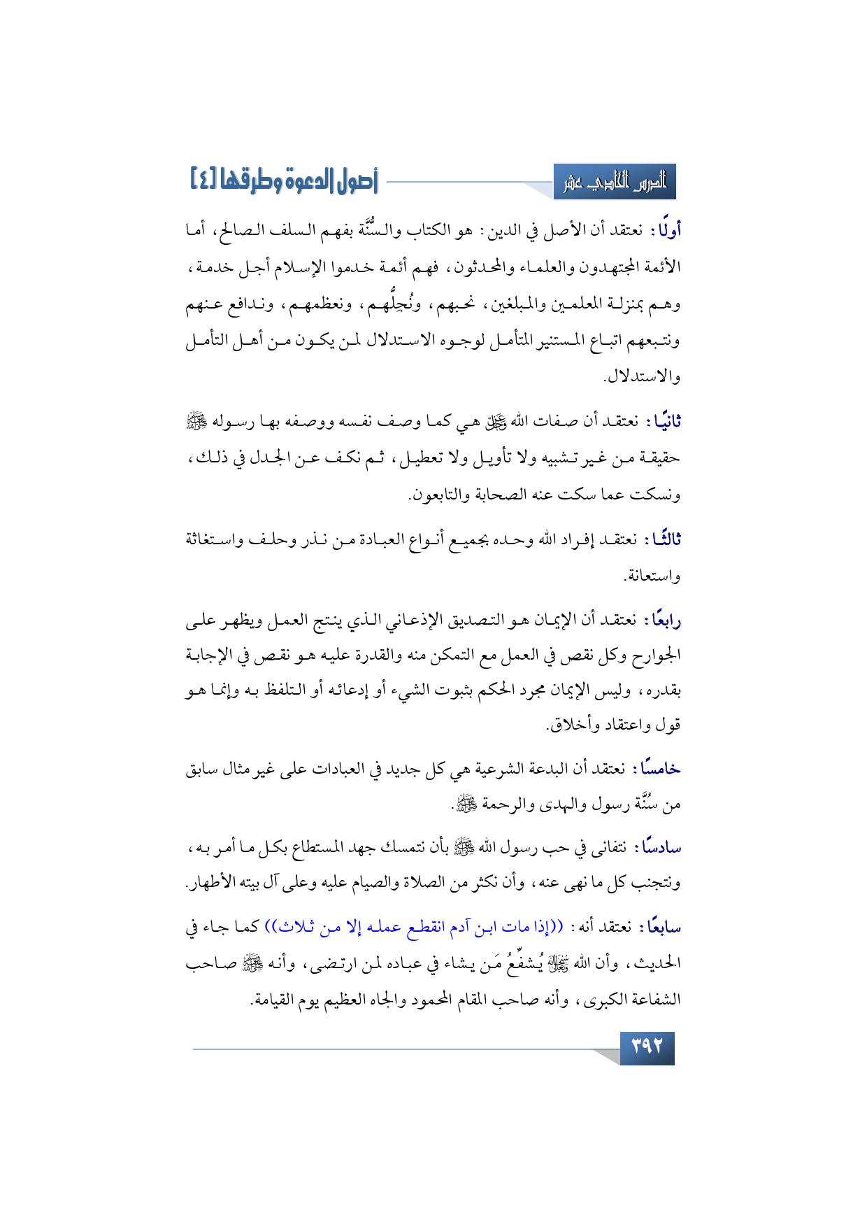 أولًا: نعتقد أن الأصل في الدين: هو الكتاب والسنة بفهم السلف الصالح، أما الأئمة المجتهدون والعلماء والمحدثون، فهم أئمة خدموا الإسلام أجل خدمة، وهم بمنزلة المعلمين والمبلغين، نحبهم، ونُجِلُّهم، ونعظمهم، وندافع عنهم ونتبعهم اتباع المستنير المتأمل لوجوه الاستدلال لمن يكون من أهل التأمل والاستدلال.