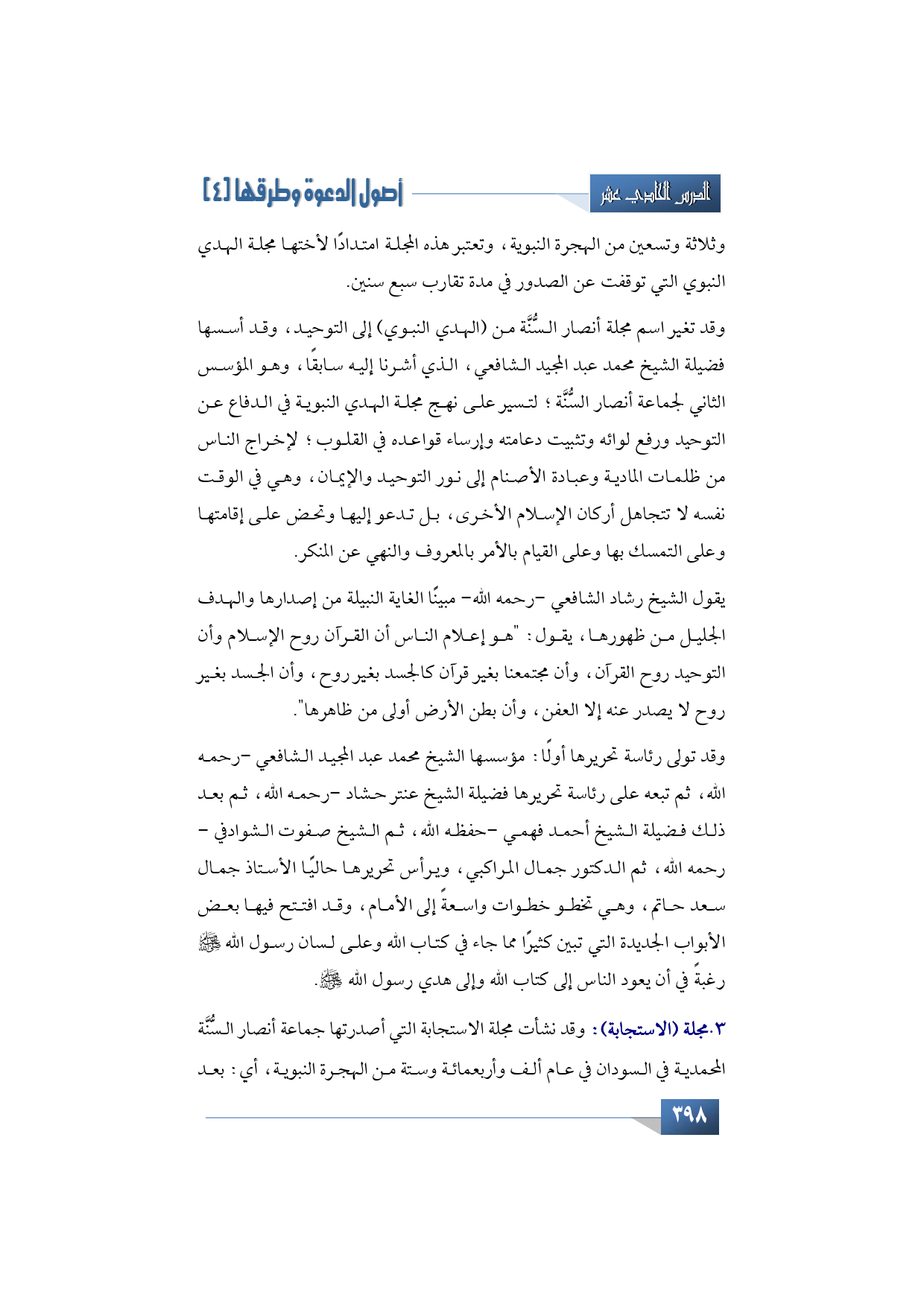 المجلة الثالثة التي أنشأتها جماعة أنصار السنة المحمدية: هي مجلة (الاستجابة)، وقد نشأت مجلة الاستجابة التي أصدرتها جماعة أنصار السنة المحمدية في السودان في عام ألف وأربعمائة وستة من الهجرة النبوية، أي: بعد