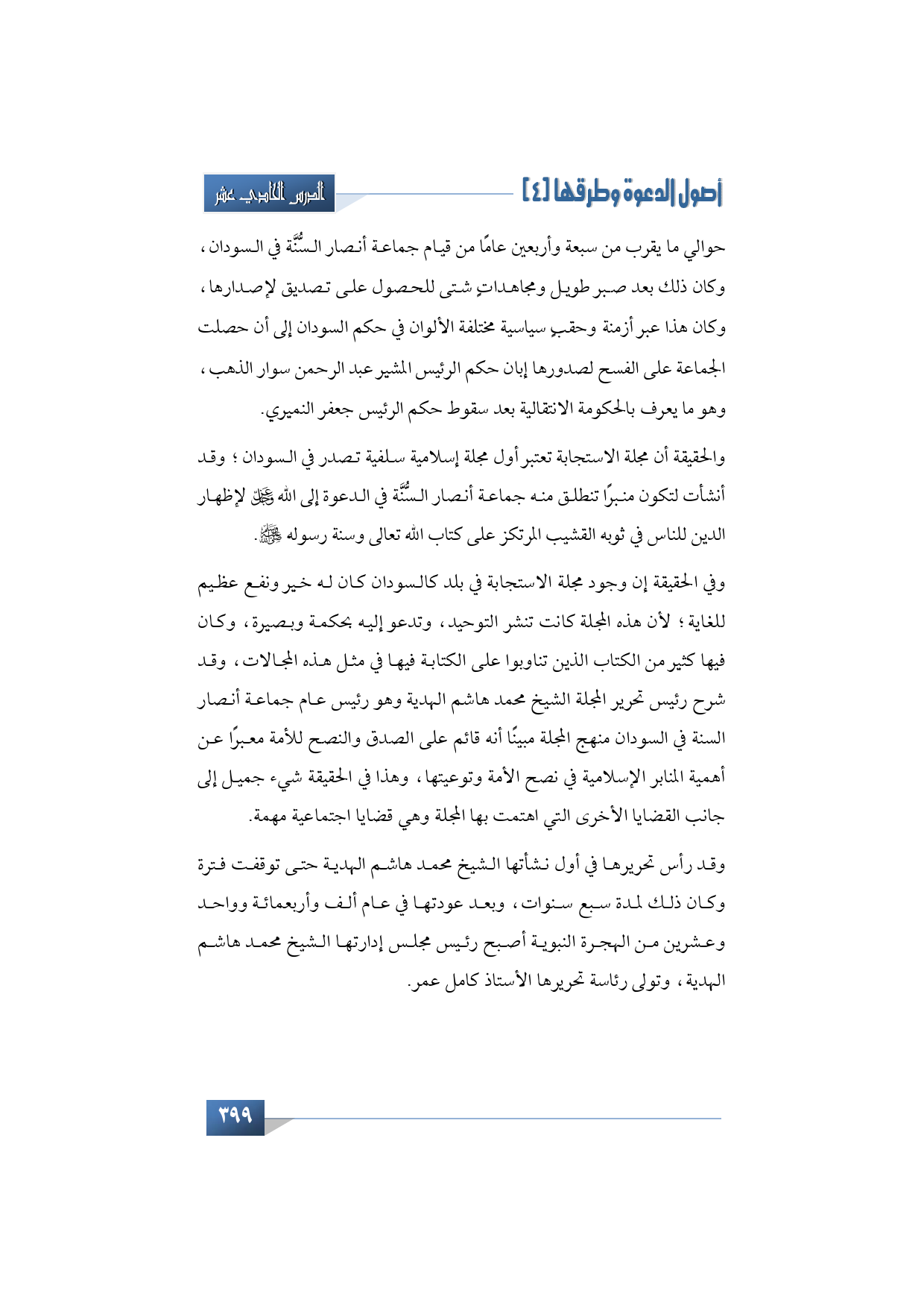 وفي الحقيقة إن وجود مجلة الاستجابة في بلد كالسودان كان له خير ونفع عظيم للغاية؛ لأن هذه المجلة كانت تنشر التوحيد، وتدعو إليه بحكمة وبصيرة، وكان فيها كثير من الكتاب الذين تناوبوا على الكتابة فيها في مثل هذه المجالات، وقد شرح رئيس تحرير المجلة الشيخ محمد هاشم الهدية وهو رئيس عام جماعة أنصار السنة في السودان منهج المجلة مبينًا أنه قائم على الصدق والنصح للأمة معبرًا عن أهمية المنابر الإسلامية في نصح الأمة وتوعيتها، وهذا في الحقيقة شيء جميل إلى جانب القضايا الأخرى التي اهتمت بها المجلة وهي قضايا اجتماعية مهمة.