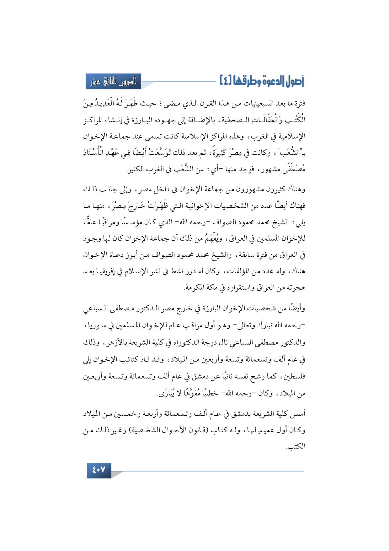 وأيضًا من شخصيات الإخوان البارزة في خارج مصر الدكتور مصطفى السباعي -رحمه الله تبارك وتعالى- وهو أول مراقب عام للإخوان المسلمين في سوريا، والدكتور مصطفى السباعي نال درجة الدكتوراه في كلية الشريعة بالأزهر، وذلك في عام ألف وتسعمائة وتسعة وأربعين من الميلاد، وقد قاد كتائب الإخوان إلى فلسطين، كما رشح نفسه نائبًا عن دمشق في عام ألف وتسعمائة وتسعة وأربعين من الميلاد، وكان -رحمه الله- خطيبًا مُفَوَّهًا لا يُبَارَى.