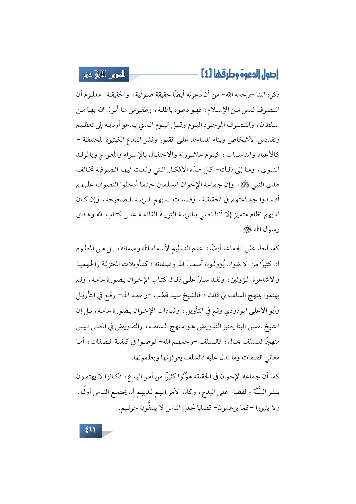 ذكره البنا -رحمه الله- من أن دعوته أيضًا حقيقة صوفية، والحقيقة: معلوم أن التصوف ليس من الإسلام، فهو دعوة باطلة، وطقوس ما أنزل الله بها من سلطان، والتصوف الموجود اليوم وقبل اليوم الذي يدعو أربابه إلى تعظيم وتقديس الأشخاص وبناء المساجد على القبور ونشر البدع الكثيرة المختلفة -كالأعياد والمناسبات؛ كيوم عاشوراء والاحتفال بالإسراء والمعراج وبالمولد النبوي، وما إلى ذلك- كل هذه الأفكار التي وقعت فيها الصوفية تخالف هدي النبي -صلى الله عليه وسلم- وإن جماعة الإخوان المسلمين حينما أدخلوا التصوف عليهم أفسدوا جماعتهم في الحقيقة، وفسدت لديهم التربية الصحيحة، وإن كان لديهم نظام متميز إلا أنني أعني بالتربية: التربيةِ القائمة على كتاب الله وهدي رسول الله -صلى الله عليه وسلم.
