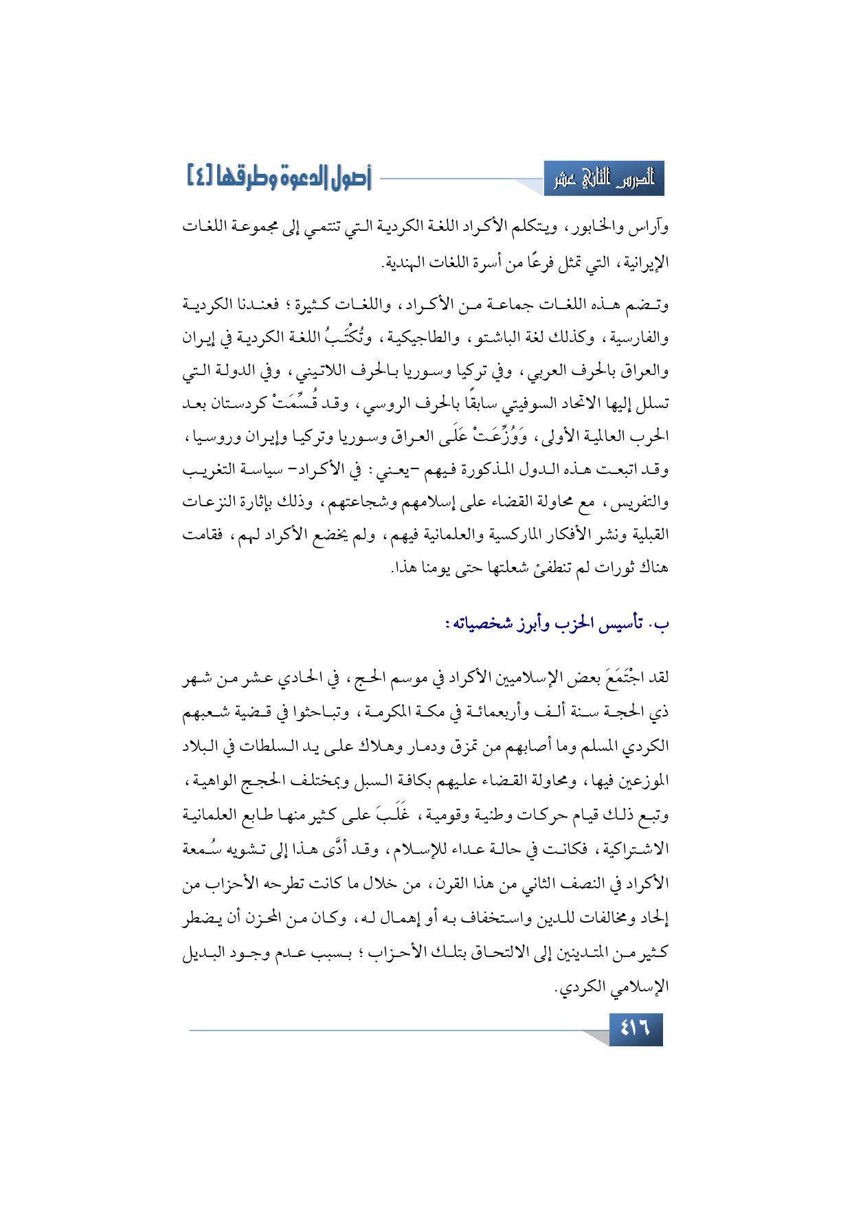 ب- بعنوان تأسيس الحزب وأبرز شخصياته، أقول في تأسيس الحزب: بأنه قد اجْتَمَعَ بعض الإسلاميين الأكراد في موسم الحج، في الحادي عشر من شهر ذي الحجة سنة ألف وأربعمائة في مكة المكرمة، وتباحثوا في قضية شعبهم الكردي المسلم وما أصابهم من تمزق ودمار وهلاك على يد السلطات في البلاد الموزعين فيها، ومحاولة القضاء عليهم بكافة السبل وبمختلف الحجج الواهية، وتبع ذلك قيام حركات وطنية وقومية، غَلَبَ على كثير منها طابع العلمانية الاشتراكية، فكانت في حالة عداء للإسلام، وقد أدى هذا إلى تشويه سمعة الأكراد في النصف الثاني من هذا القرن، من خلال ما كانت تطرحه الأحزاب من إلحاد ومخالفات للدين واستخفاف به أو إهمال له، وكان من المحزن أن يضطر كثير من المتدينين إلى الالتحاق بتلك الأحزاب؛ بسبب عدم وجود البديل الإسلامي الكردي.