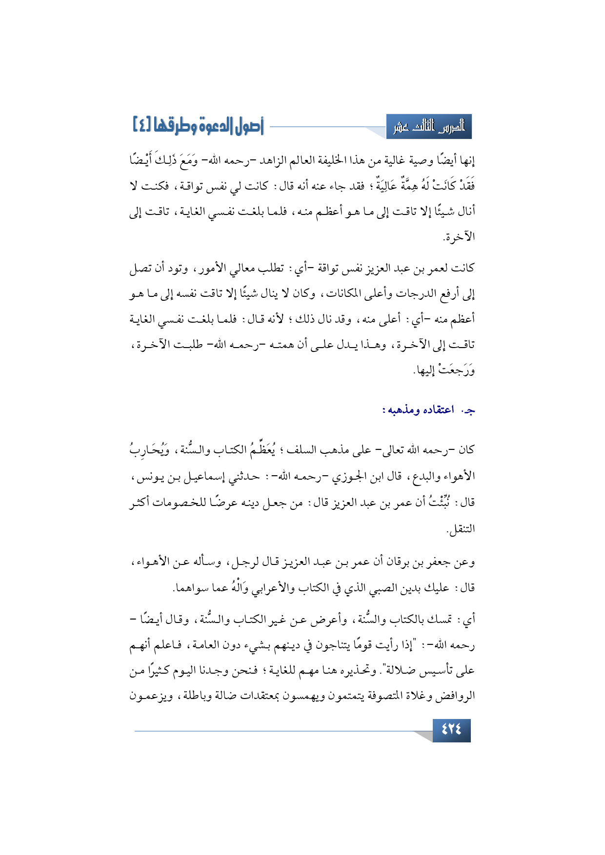 جـ- كان -رحمه الله تعالى- على مذهب السلف؛ يُعَظِّمُ الكتاب والسنة، وَيُحَارِبُ الأهواء والبدع، قال ابن الجوزي -رحمه الله-: حدثني إسماعيل بن يونس، قال: نُبِّئْتُ أن عمر بن عبد العزيز قال: من جعل دينه عرضًا للخصومات أكثر التنقل.