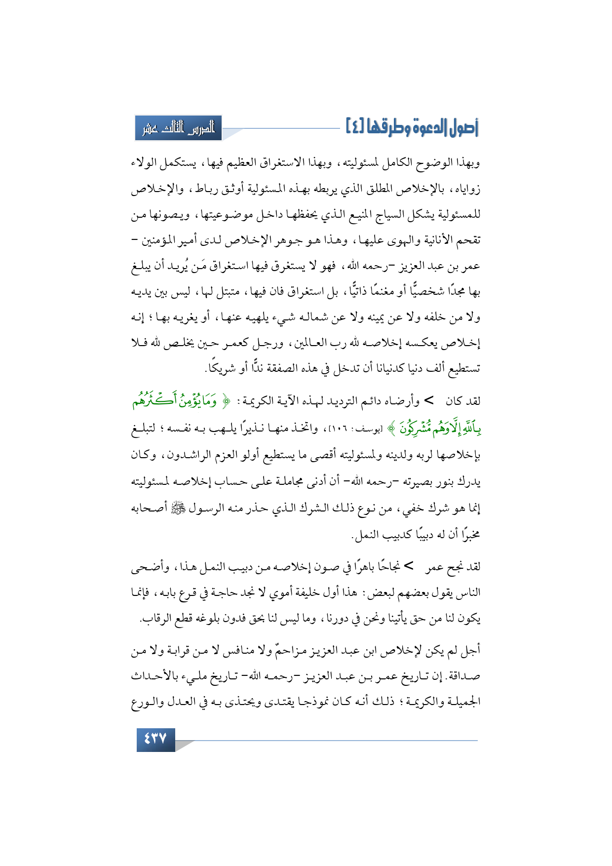 لقد كان رضي الله عنه وأرضاه دائم الترديد لهذه الآية الكريمة: {وَمَا يُؤْمِنُ أَكْثَرُهُمْ بِاللَّهِ إِلَّا وَهُمْ مُشْرِكُونَ} (يوسف: من الآية: 106) واتخذ منها نذيرًا يلهب به نفسه؛ لتبلغ بإخلاصها لربه ولدينه ولمسئوليته أقصى ما يستطيع أولو العزم الراشدون، وكان يدرك بنور بصيرته -رحمه الله- أن أدنى مجاملة على حساب إخلاصه لمسئوليته إنما هو شرك خفي، من نوع ذلك الشرك الذي حذر منه الرسول -صلى الله عليه وآله وسلم- أصحابه مخبرًا أن له دبيبًا كدبيب النمل.