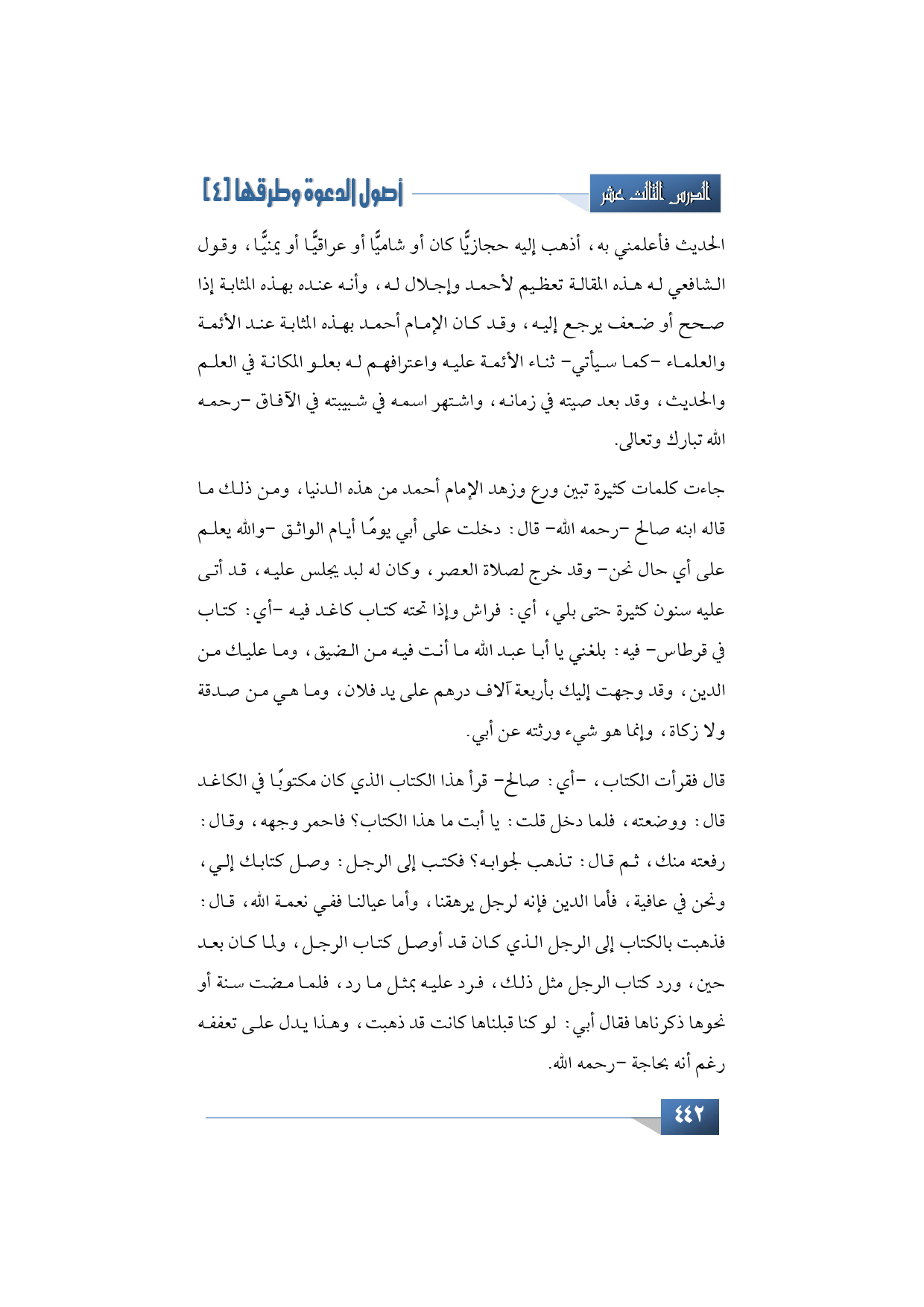 جاءت كلمات كثيرة تبين ورع وزهد وتقلل الإمام أحمد -رحمه الله تبارك وتعالى- من هذه الدنيا، ومن ذلك ما قاله ابنه صالح -رحمه الله- قال: دخلت على أبي يومًا أيام الواثق -والله يعلم على أي حال نحن- وقد خرج لصلاة العصر، وكان له لبد يجلس عليه، قد أتى عليه سنون كثيرة حتى بلي، يعني: فراش وإذا تحته كتاب كاغد فيه -يعني: كتاب في قرطاس- فيه: بلغني يا أبا عبد الله ما أنت فيه من الضيق، وما عليك من الدين، وقد وجهت إليك بأربعة آلاف درهم على يد فلان، وما هي من صدقة ولا زكاة، وإنما هو شيء ورثته عن أبي.