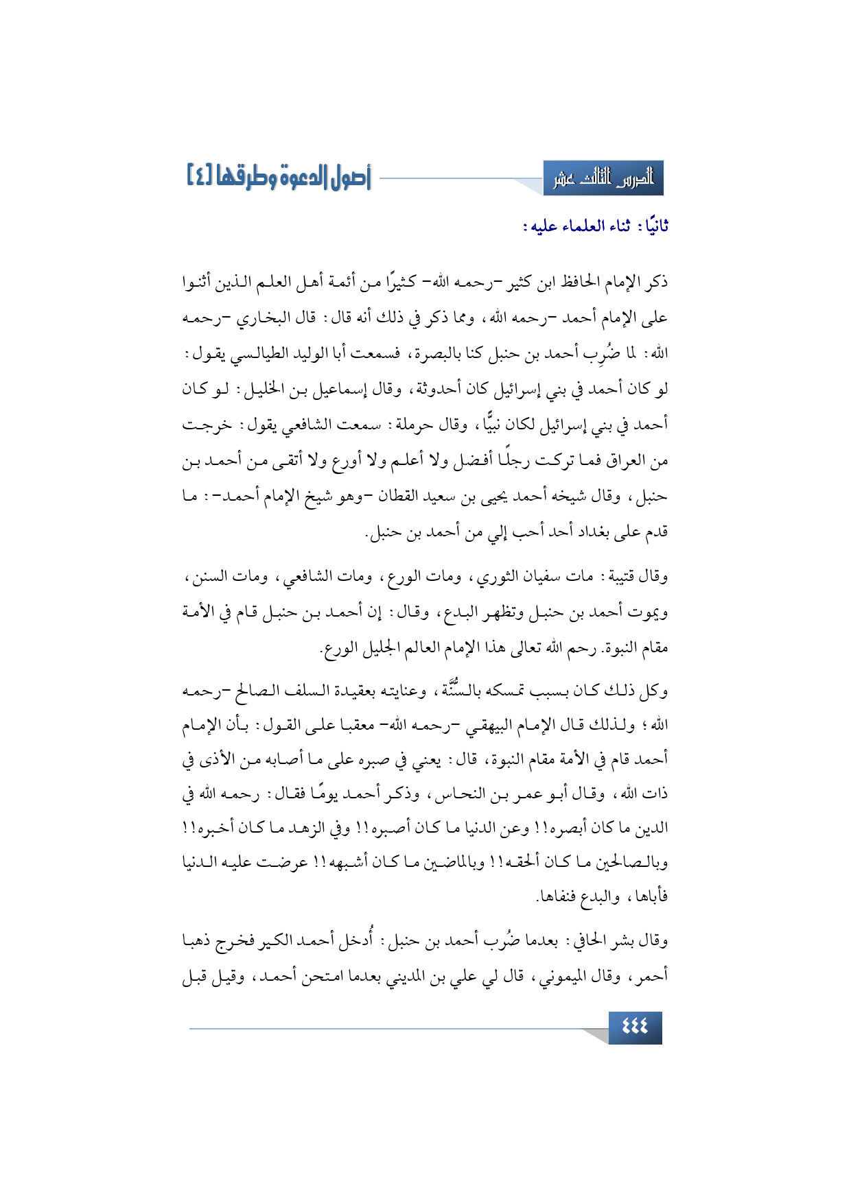 وكل ذلك كان بسبب تمسكه بالسنة، وعنايته بعقيدة السلف الصالح -رحمه الله تبارك وتعالى، ولذلك قال الإمام البيهقي -رحمه الله عز وجل- معقبا على القول: بأن الإمام أحمد قام في الأمة مقام النبوة، قال: يعني في صبره على ما أصابه من الأذى في ذات الله، وقال أبو عمر بن النحاس، وذكر أحمد يومًا فقال: رحمه الله في الدين ما كان أبصره!! وعن الدنيا ما كان أصبره!! وفي الزهد ما كان أخبره!! وبالصالحين ما كان ألحقه!! وبالماضين ما كان أشبهه!! عرضت عليه الدنيا فأباها، والبدع فنفاها.