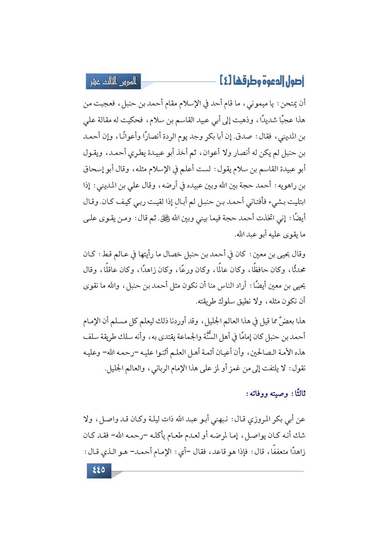 أن يمتحن: يا ميموني، ما قام أحد في الإسلام مقام أحمد بن حنبل، فعجبت من هذا عجبًا شديدًا، وذهبت إلى أبي عبيد القاسم بن سلام، فحكيت له مقالة علي بن المديني، فقال: صدق. إن أبا بكر وجد يوم الردة أنصارًا وأعوانًا، وإن أحمد بن حنبل لم يكن له أنصار ولا أعوان، ثم أخذ أبو عبيدة يطري أحمد، ويقول أبو عبيدة القاسم بن سلام يقول: لست أعلم في الإسلام مثله، وقال أبو إسحاق بن راهويه: أحمد حجة بين الله وبين عبيده في أرضه، وقال علي بن المديني: إذا ابتليت بشيء فأفتاني أحمد بن حنبل لم أبالِ إذا لقيت ربي كيف كان. وقال أيضًا: إني اتخذت أحمد حجة فيما بيني وبين الله -عز وجل. ثم قال: ومن يقوى على ما يقوى عليه أبو عبد الله.