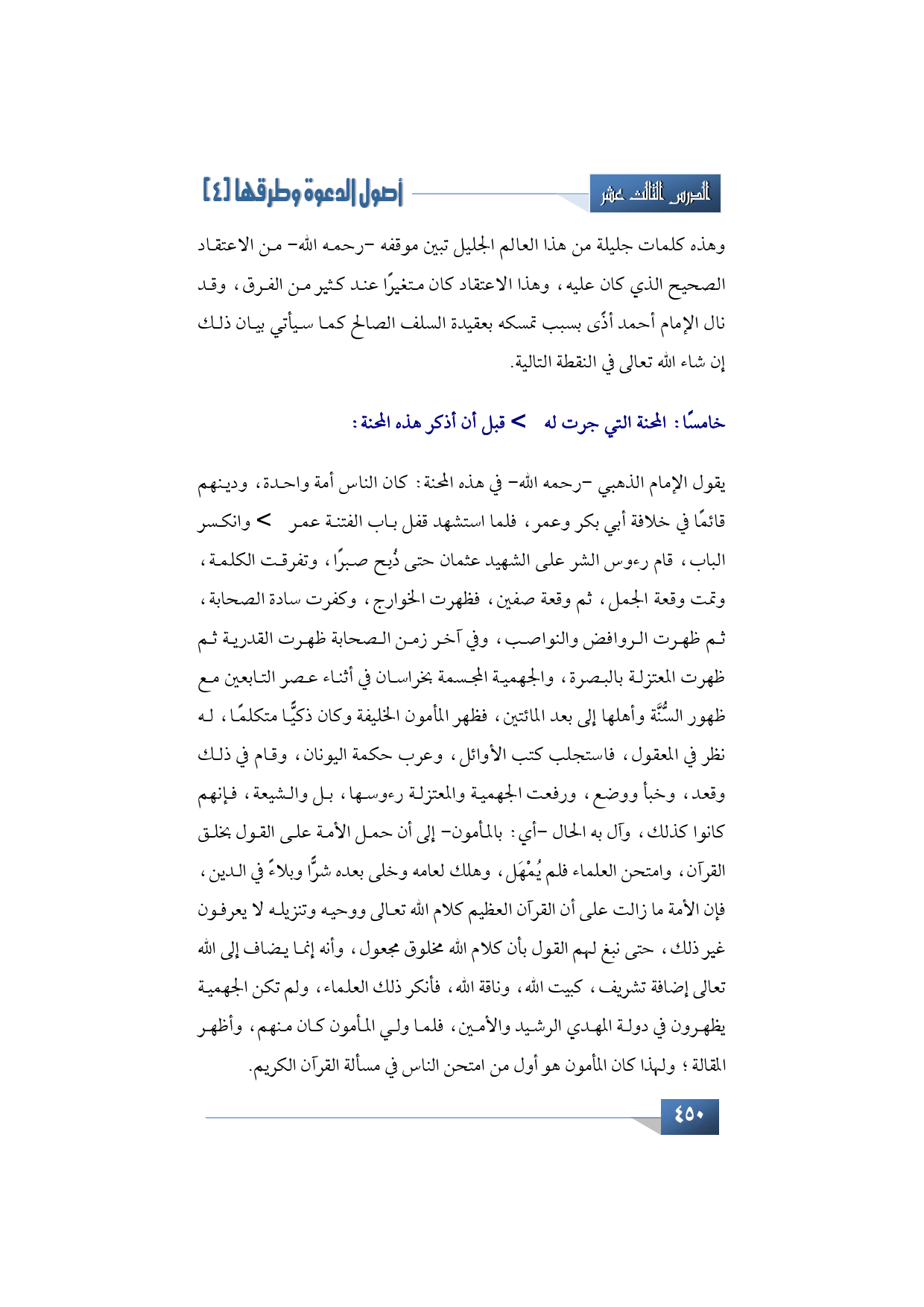 أود أن أذكر بين يدي هذه المحنة كلمات قليلات للإمام الذهبي -رحمه الله- قال فيها: كان الناس أمة واحدة، ودينهم قائمًا في خلافة أبي بكر وعمر، فلما استشهد قفل باب الفتنة عمر -رضي الله عنه- وانكسر الباب، قام رءوس الشر على الشهيد عثمان حتى ذُبِح صبرًا، وتفرقت الكلمة، وتمت وقعة الجمل، ثم وقعة صفين، فظهرت الخوارج، وكفرت سادة الصحابة، ثم ظهرت الروافض والنواصب، وفي آخر زمن الصحابة ظهرت القدرية ثم ظهرت المعتزلة بالبصرة، والجهمية المجسمة بخراسان في أثناء عصر التابعين مع ظهور السنة وأهلها إلى بعد المائتين، فظهر المأمون الخليفة وكان ذكيًّا متكلمًا، له نظر في المعقول، فاستجلب كتب الأوائل، وعرب حكمة اليونان، وقام في ذلك وقعد، وخبأ ووضع، ورفعت الجهمية والمعتزلة رءوسها، بل والشيعة، فإنهم كانوا كذلك، وآل به الحال -أعني بالمأمون- إلى أن حمل الأمة على القول بخلق القرآن، وامتحن العلماء فلم يُمْهَل، وهلك لعامه وخلى بعده شرًّا وبلاءً في الدين، فإن الأمة ما زالت على أن القرآن العظيم كلام الله تعالى ووحيه وتنزيله لا يعرفون غير ذلك، حتى نبغ لهم القول بأن كلام الله مخلوق مجعول، وأنه إنما يضاف إلى الله تعالى إضافة تشريف، كبيت الله، وناقة الله، فأنكر ذلك العلماء، ولم تكن الجهمية يظهرون في دولة المهدي الرشيد والأمين، فلما ولي المأمون كان منهم، وأظهر المقالة، ولهذا كان المأمون هو أول من امتحن الناس في مسألة القرآن الكريم.