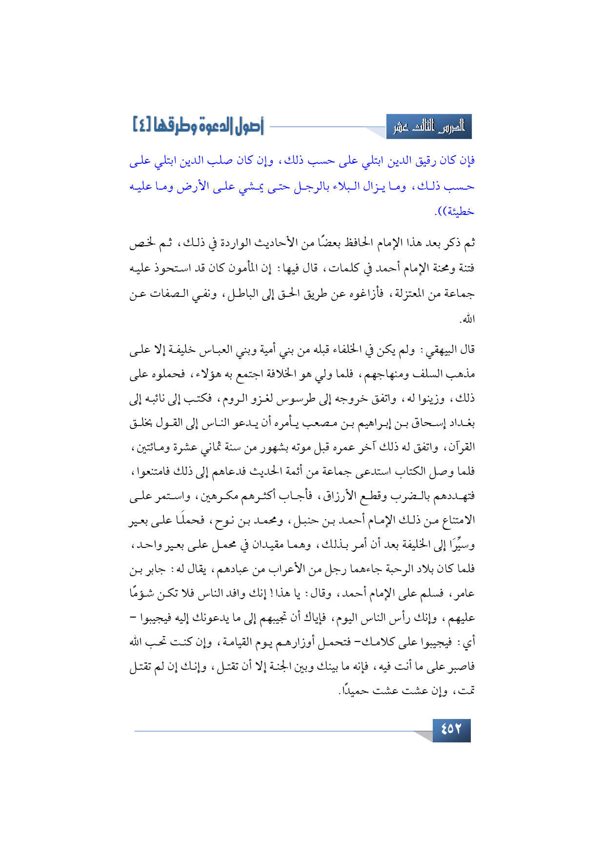 قال البيهقي: ولم يكن في الخلفاء قبله من بني أمية وبني العباس خليفة إلا على مذهب السلف ومنهاجهم، فلما ولي هو الخلافة اجتمع به هؤلاء، فحملوه على ذلك، وزينوا له، واتفق خروجه إلى طرسوس لغزو الروم، فكتب إلى نائبه إلى بغداد إسحاق بن إبراهيم بن مصعب يأمره أن يدعو الناس إلى القول بخلق القرآن، واتفق له ذلك آخر عمره قبل موته بشهور من سنة ثماني عشرة ومائتين، فلما وصل الكتاب -كما ذكرنا- استدعى جماعة من أئمة الحديث فدعاهم إلى ذلك فامتنعوا، فتهددهم بالضرب وقطع الأرزاق، فأجاب أكثرهم مكرهين، واستمر على الامتناع من ذلك الإمام أحمد بن حنبل، ومحمد بن نوح، فحملَا على بعير وسيِّرَا إلى الخليفة بعد أن أمر بذلك، وهما مقيدان في محمل على بعير واحد، فلما كان بلاد الرحبة جاءهما رجل من الأعراب من عبادهم، يقال له: جابر بن عامر، فسلم على الإمام أحمد، وقال: يا هذا!! إنك وافد الناس فلا تكن شؤمًا عليهم، وإنك رأس الناس اليوم، فإياك أن تجيبهم إلى ما يدعونك إليه فيجيبوا -يعني فيجيبوا على كلامك- فتحمل أوزارهم يوم القيامة، وإن كنت تحب الله فاصبر على ما أنت فيه، فإنه ما بينك وبين الجنة إلا أن تقتل، وإنك إن لم تقتل تمت، وإن عشت عشت حميدًا.