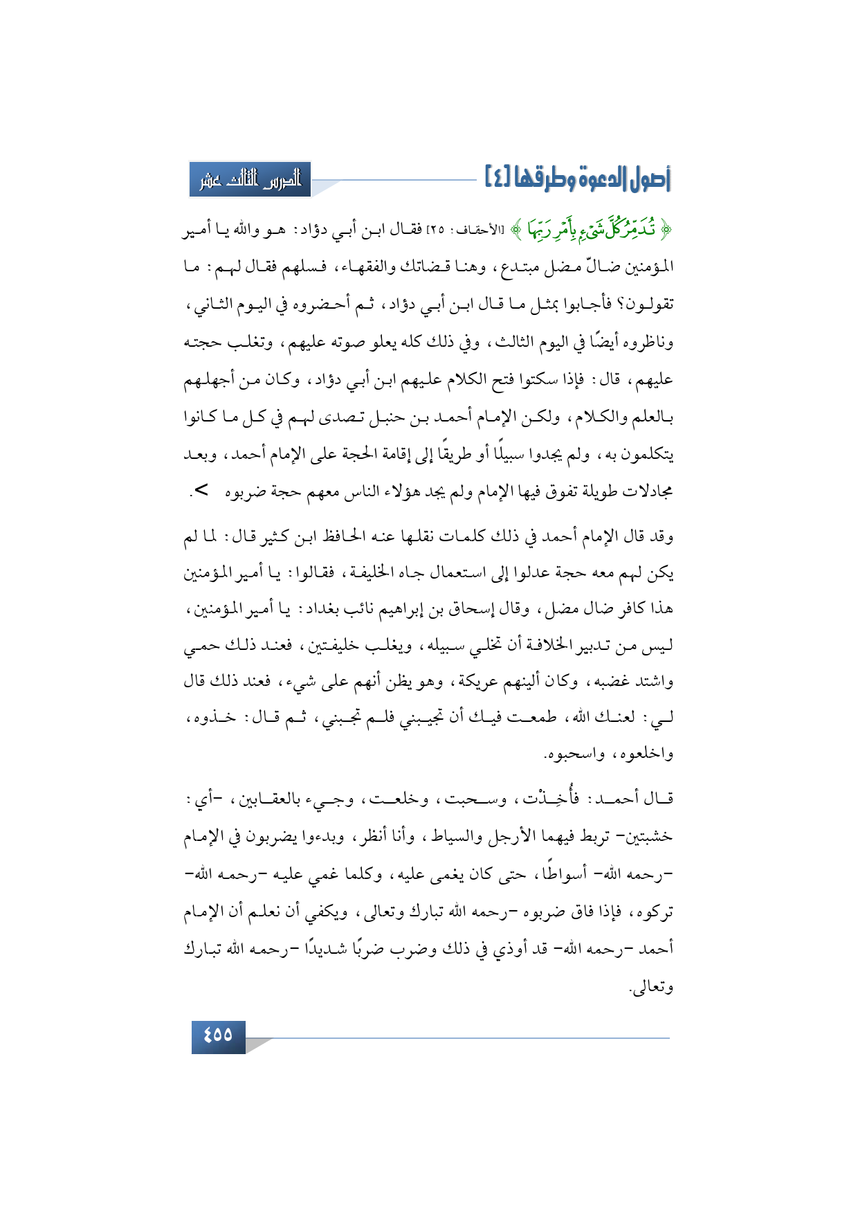 {تُدَمِّرُ كُلَّ شَيْءٍ بِأَمْرِ رَبِّهَا} (الأحقاف: 24) فقال ابن أبي دؤاد: هو والله يا أمير المؤمنين ضالّ مضل مبتدع، وهنا قضاتك والفقهاء، فسلهم فقال لهم: ما تقولون؟ فأجابوا بمثل ما قال ابن أبي دؤاد، ثم أحضروه في اليوم الثاني، وناظروه أيضًا في اليوم الثالث، وفي ذلك كله يعلو صوته عليهم، وتغلب حجته عليهم، قال: فإذا سكتوا فتح الكلام عليهم ابن أبي دؤاد، وكان من أجهلهم بالعلم والكلام، ولكن الإمام أحمد بن حنبل تصدى لهم في كل ما كانوا يتكلمون به، ولم يجدوا سبيلًا أو طريقًا إلى إقامة الحجة على الإمام أحمد -رحمه الله تبارك وتعالى- وبعد مجادلات طويلة تفوق فيها الإمام -رحمه الله تبارك وتعالى- ولم يجد هؤلاء الناس معهم حجة ضربوه -رضي الله تعالى عنه.