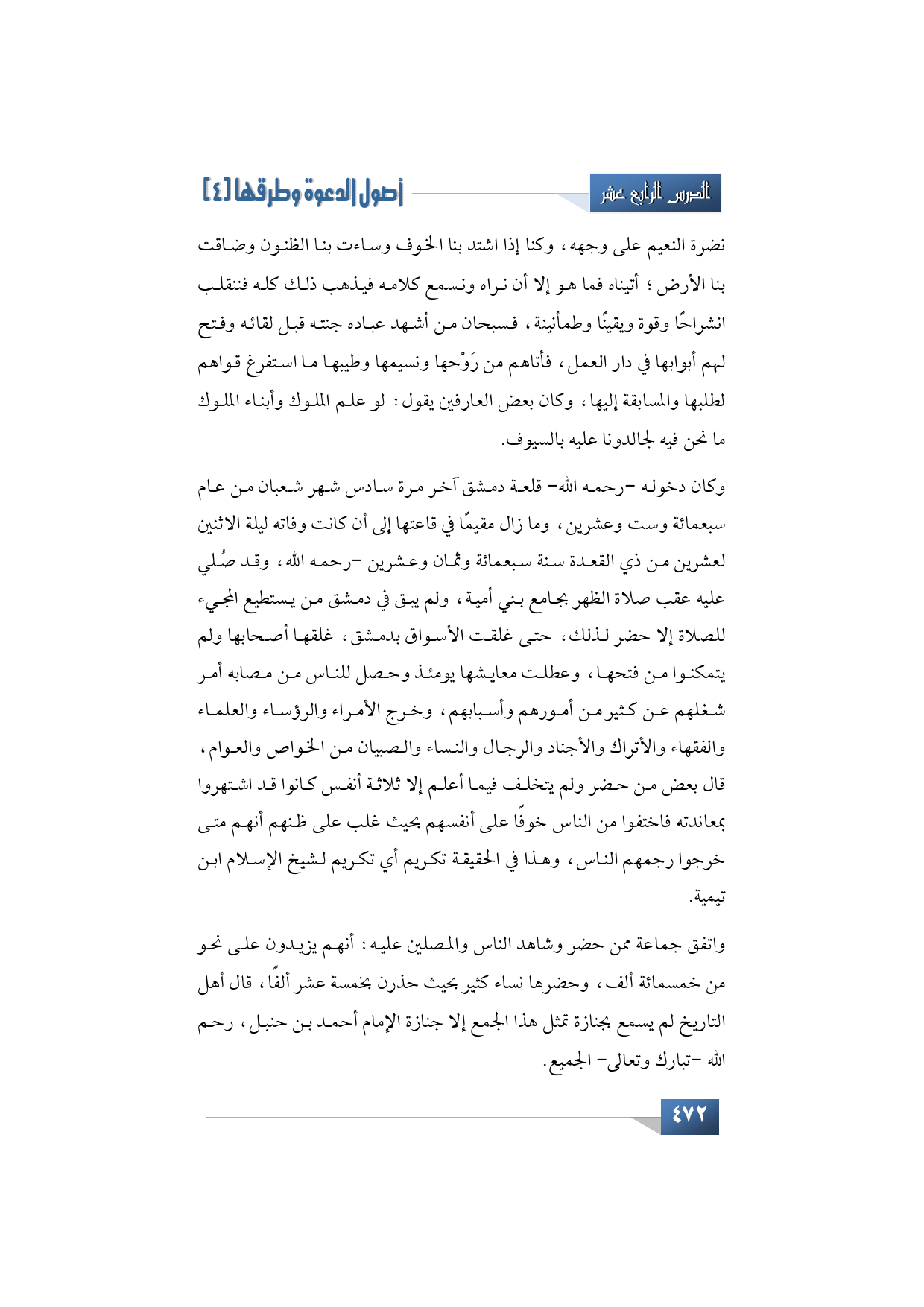 وكان دخوله -رحمه الله- قلعة دمشق آخر مرة سادس شهر شعبان من عام سبعمائة وست وعشرين، وما زال مقيمًا في قاعتها إلى أن كانت وفاته ليلة الاثنين لعشرين من ذي القعدة سنة سبعمائة وثمان وعشرين -رحمه الله تبارك وتعالى- وقد صلي عليه عقب صلاة الظهر بجامع بني أمية، ولم يبق في دمشق من يستطيع المجيء للصلاة إلا حضر لذلك، حتى غلقت الأسواق بدمشق، غلقها أصحابها ولم يتمكنوا من فتحها، وعطلت معايشها يومئذ وحصل للناس من مصابه أمر شغلهم عن كثير من أمورهم وأسبابهم، وخرج الأمراء والرؤساء والعلماء والفقهاء والأتراك والأجناد والرجال والنساء والصبيان من الخواص والعوام، قال بعض من حضر ولم يتخلف فيما أعلم إلا ثلاثة أنفس كانوا قد اشتهروا بمعاندته فاختفوا من الناس خوفًا على أنفسهم بحيث غلب على ظنهم أنهم متى خرجوا رجمهم الناس، وهذا في الحقيقة تكريم أي تكريم لشيخ الإسلام ابن تيمية.