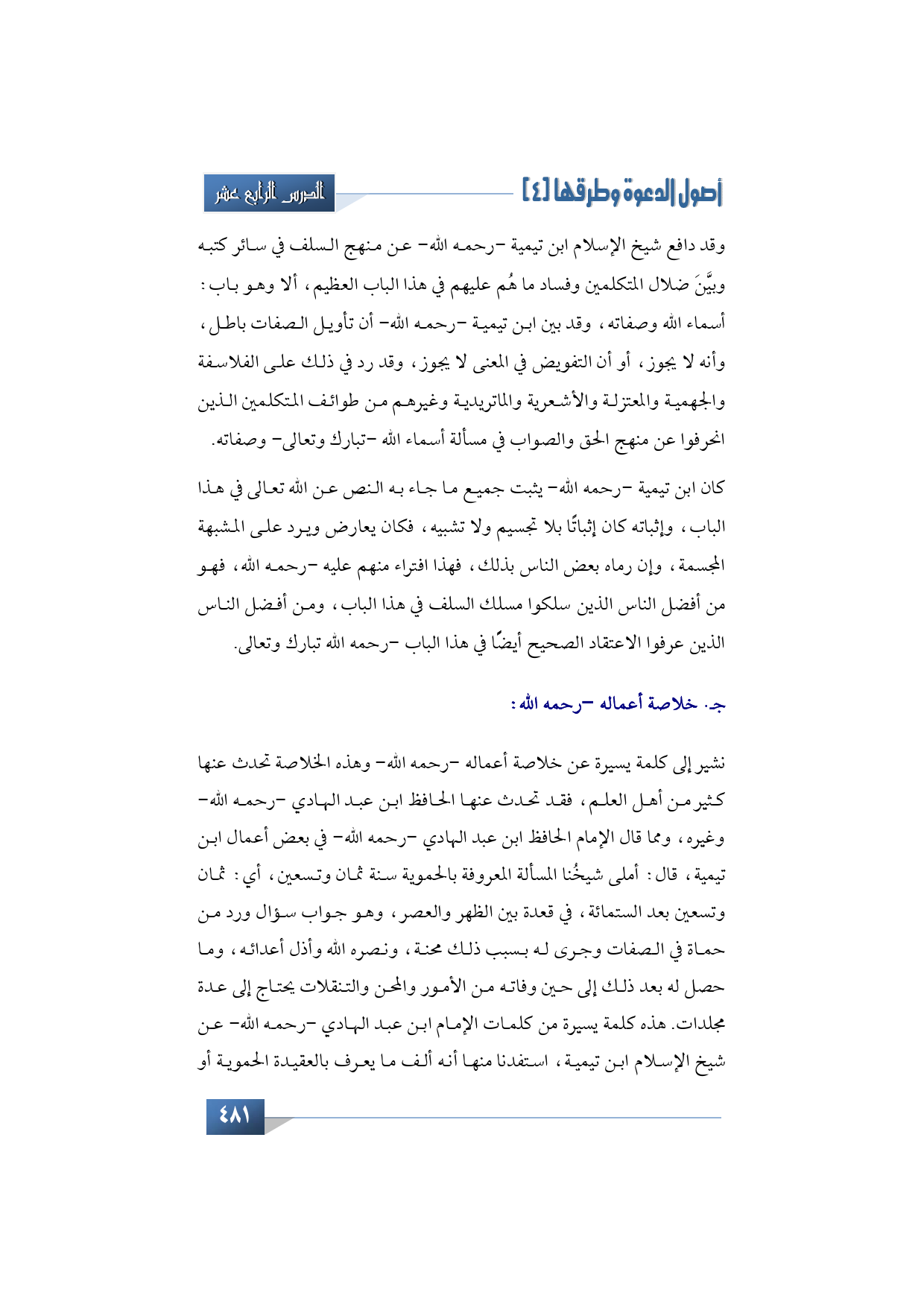 بعد ذكري الطويل في ترجمة شيخ الإسلام ابن تيمية أود أن أذكر كلمة يسيرة عن خلاصة أعماله -رحمه الله- وهذه الخلاصة تحدث عنها كثير من أهل العلم، تحدث عنها الحافظ ابن عبد الهادي -رحمه الله تبارك وتعالى- وغيره، ومما قال الإمام الحافظ ابن عبد الهادي -رحمه الله- في بعض أعمال ابن تيمية، قال: أملى شيخنا المسألة المعروفة بالحموية سنة ثمان وتسعين، يعني: ثمان وتسعين بعد الستمائة، في قعدة بين الظهر والعصر، وهو جواب سؤال ورد من حماة في الصفات وجرى له بسبب ذلك محنة، ونصره الله وأذل أعدائه، وما حصل له بعد ذلك إلى حين وفاته من الأمور والمحن والتنقلات يحتاج إلى عدة مجلدات. هذه كلمة يسيرة من كلمات الإمام ابن عبد الهادي -رحمه الله- عن شيخ الإسلام ابن تيمية، استفدنا منها أنه ألف ما يعرف بالعقيدة الحموية أو