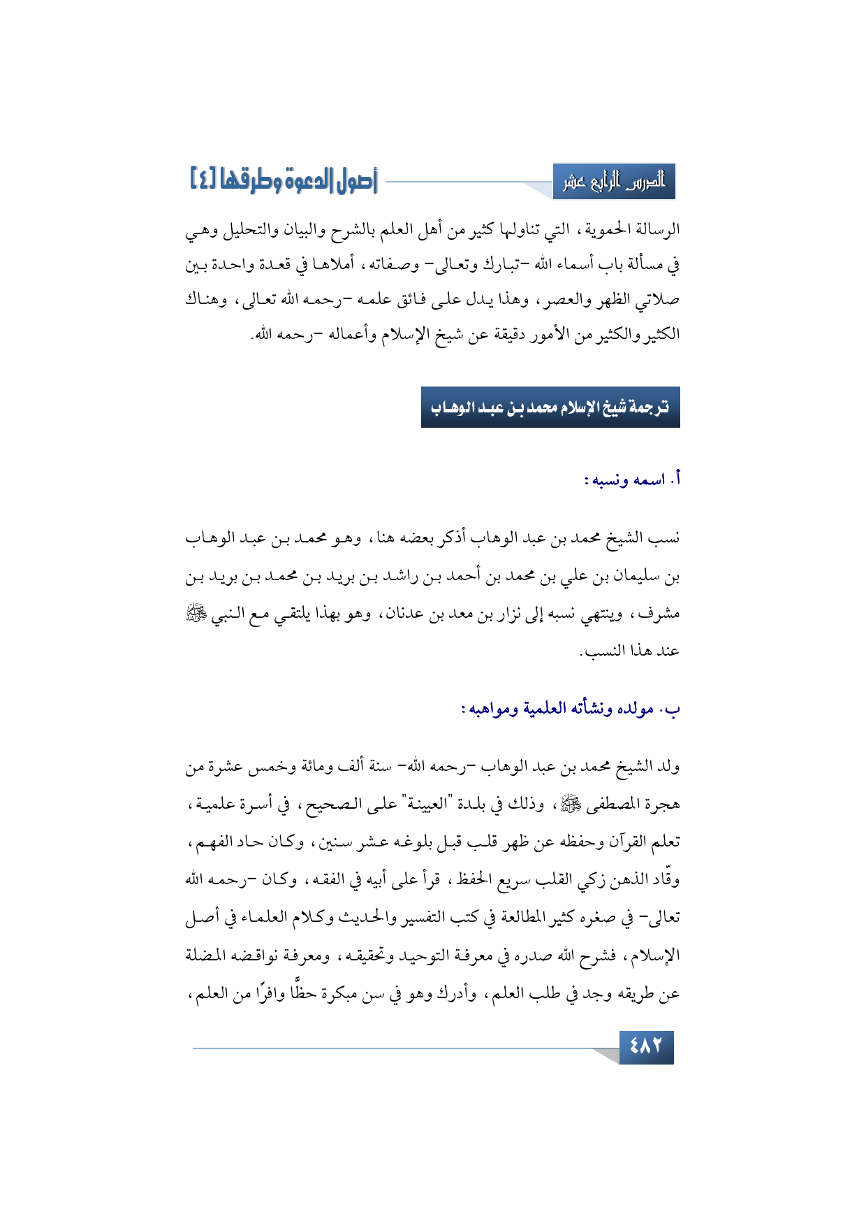 أنتقل بعد ذلك إلى ترجمة شيخ الإسلام الإمام محمد بن عبد الوهاب -رحمه الله تبارك وتعالى- وأبدأ بسيرته الذاتية، وهذا العنصر يشتمل على النقاط التالية: