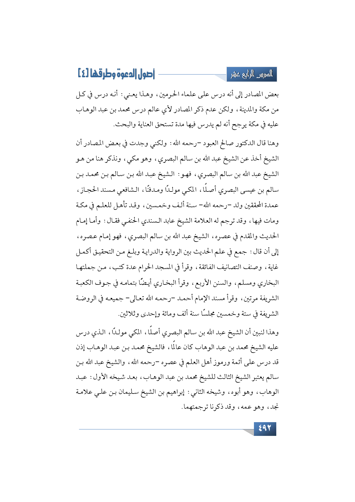 وقد ذكرت عن هذا الشيخ لأبين أن الشيخ عبد الله بن سالم البصري أصلًا، المكي مولدًا، الذي درس عليه الشيخ محمد بن عبد الوهاب كان عالمًا، فالشيخ محمد بن عبد الوهاب إذن قد درس على أئمة ورموز أهل العلم في عصره -رحمه الله تبارك وتعالى- وهذا الشيخ عبد الله بن سالم يعتبر هو الشيخ الثالث للشيخ محمد بن عبد الوهاب، بعد شيخه الأول: أبيه عبد الوهاب، وشيخه عمه الثاني: إبراهيم ابني الشيخ سليمان بن علي علامة نجد،