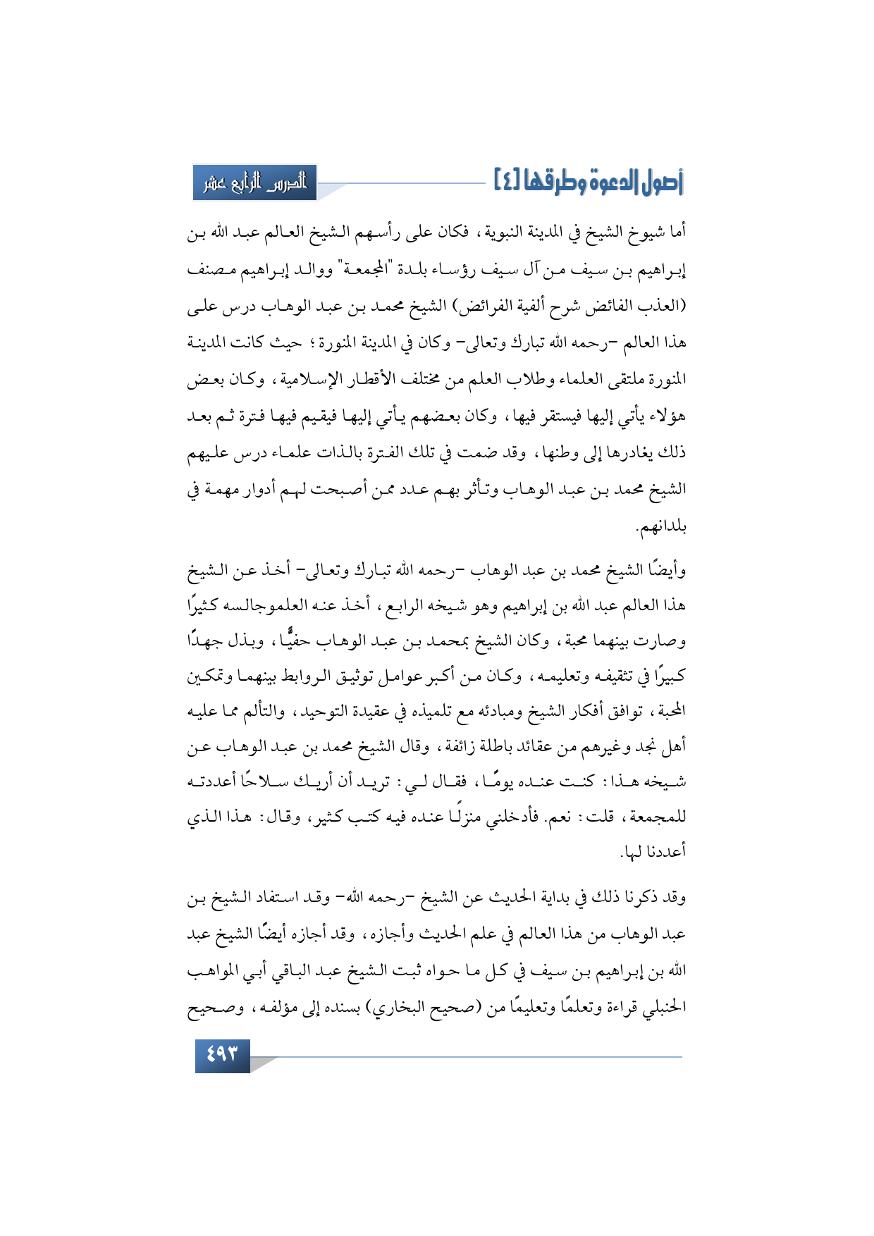 وقد ذكرت ذلك في بداية الحديث عن الشيخ -رحمه الله- وقد استفاد الشيخ بن عبد الوهاب من هذا العالم في علم الحديث وأجازه، وقد أجازه أيضًًا الشيخ عبد الله بن إبراهيم بن سيف في كل ما حواه ثبت الشيخ عبد الباقي أبي المواهب الحنبلي قراءة وتعلمًا وتعليمًا من "صحيح البخاري" بسنده إلى مؤلفه، وصحيح