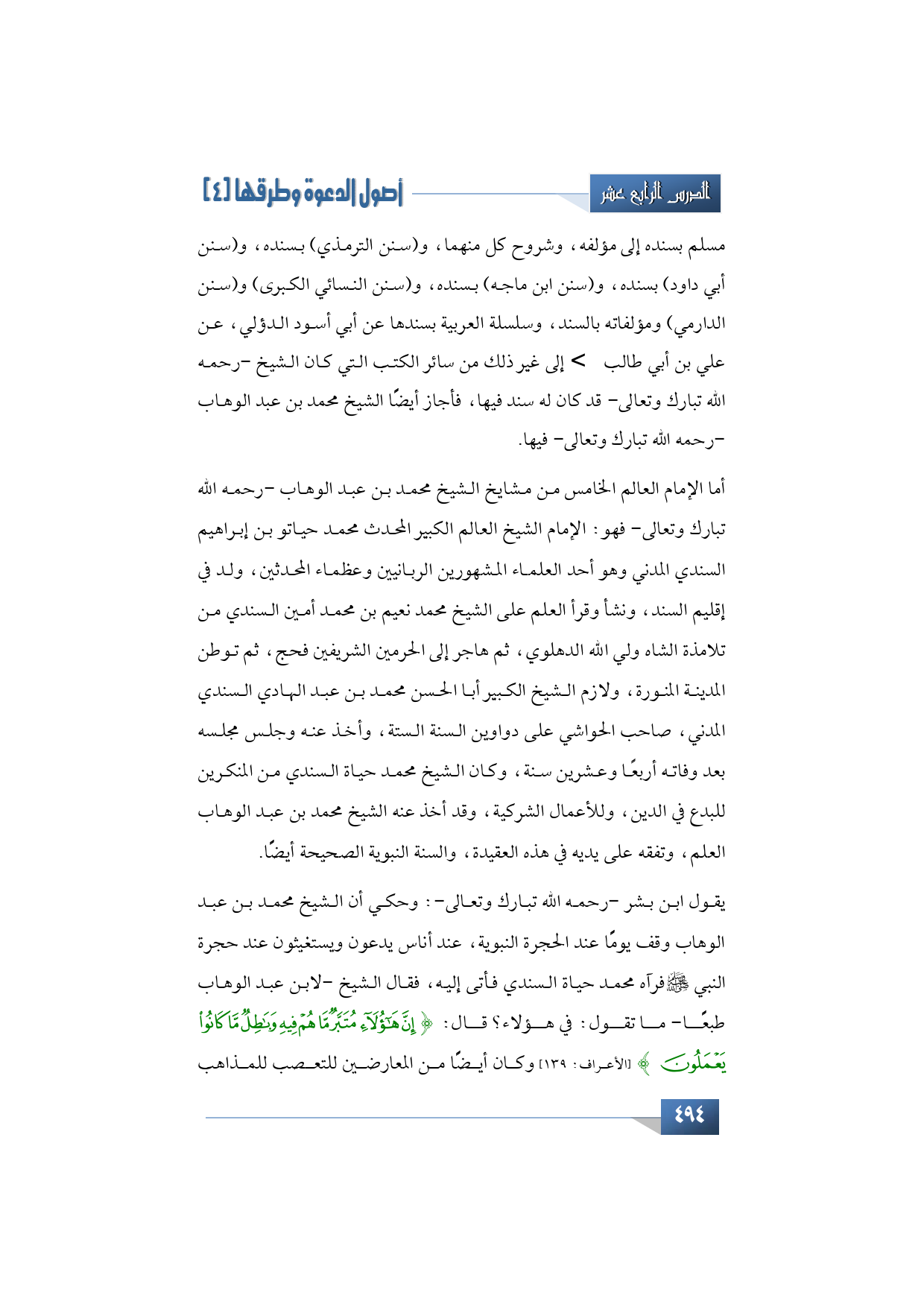 يقول ابن بشر -رحمه الله تبارك وتعالى-: وحكي أن الشيخ محمد بن عبد الوهاب وقف يومًًا عند الحجرة النبوية، عند أناس يدعون ويستغيثون عند حجرة النبي -صلى الله عليه وآله وسلم- فرآه محمد حياة السندي فأتى إليه، فقال الشيخ -لابن عبد الوهاب طبعًًا- ما تقول: في هؤلاء؟ قال: {إِنَّ هَؤُلاءِ مُتَبَّرٌ مَا هُمْ فِيهِ وَبَاطِلٌ مَا كَانُوا يَعْمَلُون} (سورة الأعراف: الآية: 139) وكان أيضًًا من المعارضين للتعصب للمذاهب