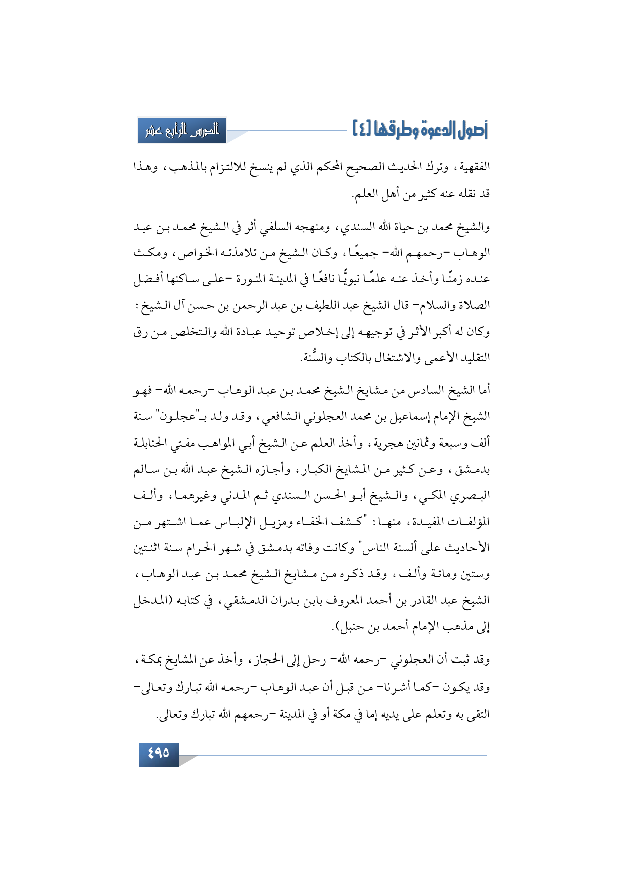 وقد ثبت أن العجلوني -رحمه الله- رحل إلى الحجاز، وأخذ عن المشايخ بمكة، وقد يكون -كما أشرنا- من قبل أن عبد الوهاب -رحمه الله تبارك وتعالى- التقى به وتعلم على يديه إما في مكة أو في المدينة -رحمهم الله تبارك وتعالى.