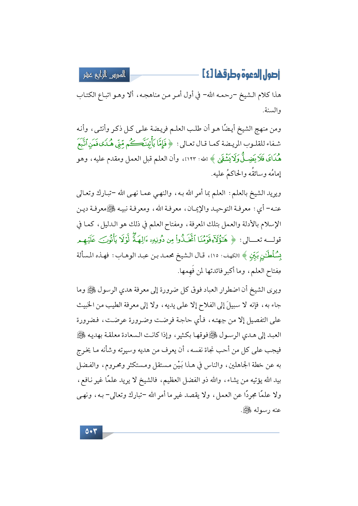 ويريد الشيخ بالعلم: العلم بما أمر الله به، والنهي عما نهى الله -تبارك وتعالى عنه- يعني: معرفة التوحيد والإيمان، معرفة الله، ومعرفة نبيه -صلى الله عليه وآله وسلم- معرفة دين الإسلام بالأدلة والعمل بتلك المعرفة، ومفتاح العلم في ذلك هو الدليل، كما في قوله تعالى: {هَؤُلاءِ قَوْمُنَا اتَّخَذُوا مِنْ دُونِهِ آلِهَةً لَوْلا يَأْتُونَ عَلَيْهِمْ بِسُلْطَانٍ بَيِّنٍ} (الكهف: من الآية: 15) قال الشيخ محمد بن عبد الوهاب: فهذه المسألة مِفتاح العلم، وما أكبر فائدتها لمن فَهِمها.