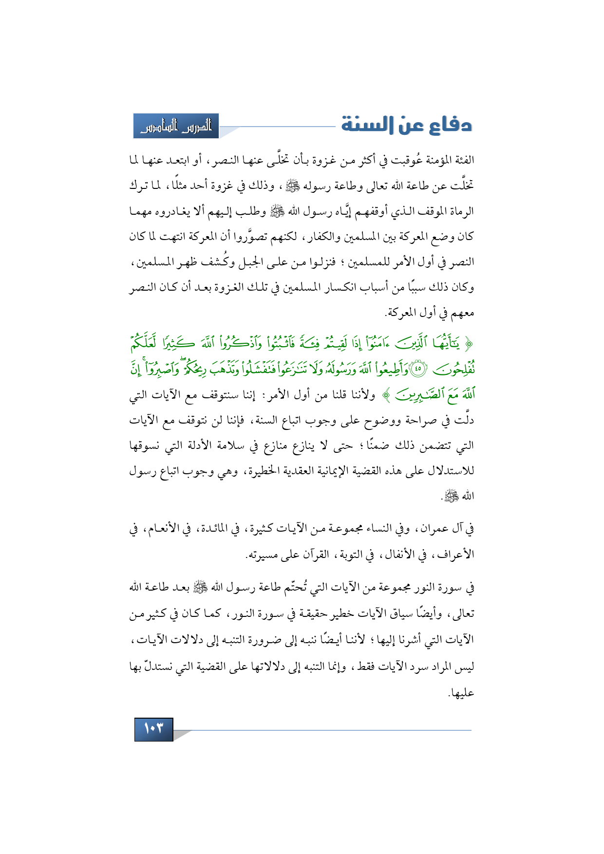 {يَا أَيُّهَا الَّذِينَ آمَنُوا إِذَا لَقِيتُمْ فِئَةً فَاثْبُتُوا وَاذْكُرُوا اللَّهَ كَثِيرًا لَعَلَّكُمْ تُفْلِحُونَ * وَأَطِيعُوا اللَّهَ وَرَسُولَهُ وَلَا تَنَازَعُوا فَتَفْشَلُوا وَتَذْهَبَ رِيحُكُمْ وَاصْبِرُوا إِنَّ اللَّهَ مَعَ الصَّابِرِينَ} ولأننا قلنا من أول الأمر: إننا سنتوقف مع الآيات التي دلَّت في صراحة ووضوح على وجوب اتباع السنة، فإننا لن نتوقف مع الآيات التي تتضمن ذلك ضمنًا؛ حتى لا ينازع منازع في سلامة الأدلة التي نسوقها للاستدلال على هذه القضية الإيمانية العقدية الخطيرة، وهي وجوب اتباع رسول الله -صلى الله عليه وسلم-.