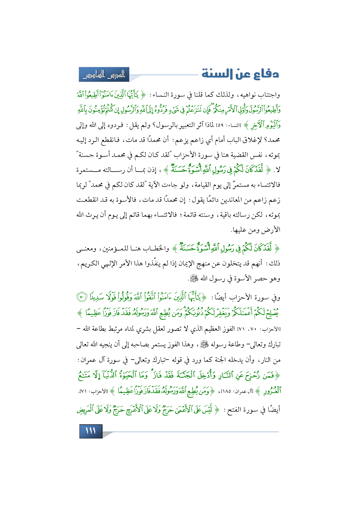 واجتناب نواهيه، ولذلك كما قلنا في سورة النساء: {يَا أَيُّهَا الَّذِينَ آمَنُوا أَطِيعُوا اللَّهَ وَأَطِيعُوا الرَّسُولَ وَأُولِي الْأَمْرِ مِنْكُمْ فَإِنْ تَنَازَعْتُمْ فِي شَيْءٍ فَرُدُّوهُ إِلَى اللَّهِ وَالرَّسُولِ إِنْ كُنْتُمْ تُؤْمِنُونَ بِاللَّهِ وَالْيَوْمِ الْآخِرِ} (النساء: 59) لماذا آثر التعبير بالرسول؟ ولم يقل: فردوه إلى الله وإلى محمد؟ لإغلاق الباب أمام أي زاعم يزعم: أن محمدًا قد مات، فانقطع الرد إليه بموته، نفس القضية هنا في سورة الأحزاب "لقد كان لكم في محمد أسوة حسنة" لا. {لَقَدْ كَانَ لَكُمْ فِي رَسُولِ اللَّهِ أُسْوَةٌ حَسَنَةٌ}، إذن بما أن رسالته مستمرة فالائتساء به مستمرٌ إلى يوم القيامة، ولو جاءت الآية "لقد كان لكم في محمد" لربما زعم زاعم من المعاندين دائمًا يقول: إن محمدًا قد مات، فالأسوة به قد انقطعت بموته، لكن رسالته باقية، وسنته قائمة؛ فالائتساء بهما قائم إلى يوم أن يرث الله الأرض ومن عليها.