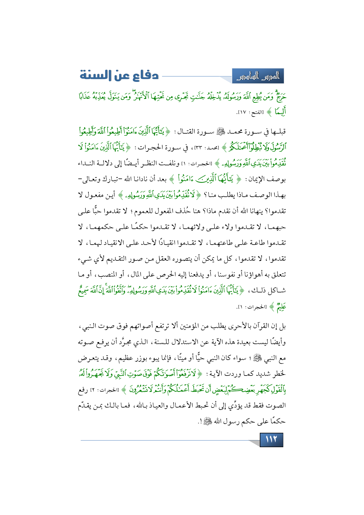 قبلها في سورة محمد -صلى الله عليه وسلم- سورة القتال: {يَا أَيُّهَا الَّذِينَ آمَنُوا أَطِيعُوا اللَّهَ وَأَطِيعُوا الرَّسُولَ وَلَا تُبْطِلُوا أَعْمَالَكُمْ} (محمد: 33)، في سورة الحجرات: {يَا أَيُّهَا الَّذِينَ آمَنُوا لَا تُقَدِّمُوا بَيْنَ يَدَيِ اللَّهِ وَرَسُولِهِ} (الحجرات: 1) ونلفت النظر أيضًا إلى دلالة النداء بوصف الإيمان: {يَا أَيُّهَا الَّذِينَ آمَنُوا} بعد أن نادانا الله -تبارك وتعالى- بهذا الوصف ماذا يطلب منا؟ {لَا تُقَدِّمُوا بَيْنَ يَدَيِ اللَّهِ وَرَسُولِهِ} أين مفعول لا تقدموا؟ ينهانا الله أن نقدم ماذا؟ هنا حُذف المفعول للعموم؛ لا تقدموا حبًّا على حبهما، لا تقدموا ولاء على ولائهما، لا تقدموا حكمًا على حكمهما، لا تقدموا طاعة على طاعتهما، لا تقدموا انقيادًا لأحد على الانقياد لهما، لا تقدموا، لا تقدموا، كل ما يمكن أن يتصوره العقل من صور التقديم لأي شيء تتعلق به أهواؤنا أو نفوسنا، أو يدفعنا إليه الحرص على المال، أو المنصب، أو ما شاكل ذلك، {يَا أَيُّهَا الَّذِينَ آمَنُوا لَا تُقَدِّمُوا بَيْنَ يَدَيِ اللَّهِ وَرَسُولِهِ وَاتَّقُوا اللَّهَ إِنَّ اللَّهَ سَمِيعٌ عَلِيم} (الحجرات: 1).