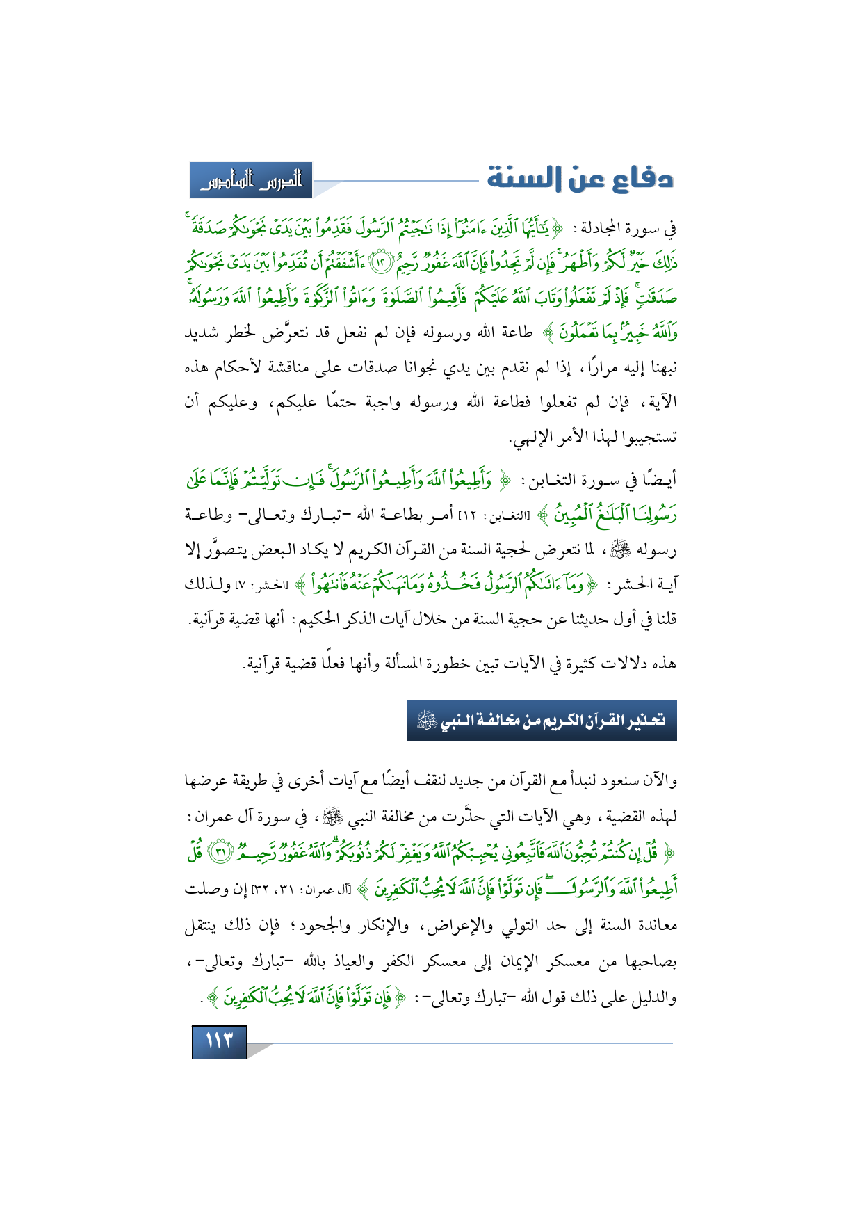 والآن سنعود لنبدأ مع القرآن من جديد لنقف أيضًا مع آيات أخرى في طريقة عرضها لهذه القضية، وهي الآيات التي حذَّرت من مخالفة النبي -صلى الله عليه وسلم-، في سورة آل عمران: {قُلْ إِنْ كُنْتُمْ تُحِبُّونَ اللَّهَ فَاتَّبِعُونِي يُحْبِبْكُمُ اللَّهُ وَيَغْفِرْ لَكُمْ ذُنُوبَكُمْ وَاللَّهُ غَفُورٌ رَحِيمٌ * قُلْ أَطِيعُوا اللَّهَ وَالرَّسُولَ فَإِنْ تَوَلَّوْا فَإِنَّ اللَّهَ لَا يُحِبُّ الْكَافِرِينَ} (آل عمران: 31، 32) إن وصلت معاندة السنة إلى حد التولي والإعراض، والإنكار والجحود؛ فإن ذلك ينتقل بصاحبها من معسكر الإيمان إلى معسكر الكفر والعياذ بالله -تبارك وتعالى-، والدليل على ذلك قول الله -تبارك وتعالى-: {فَإِنْ تَوَلَّوْا فَإِنَّ اللَّهَ لَا يُحِبُّ الْكَافِرِينَ}.