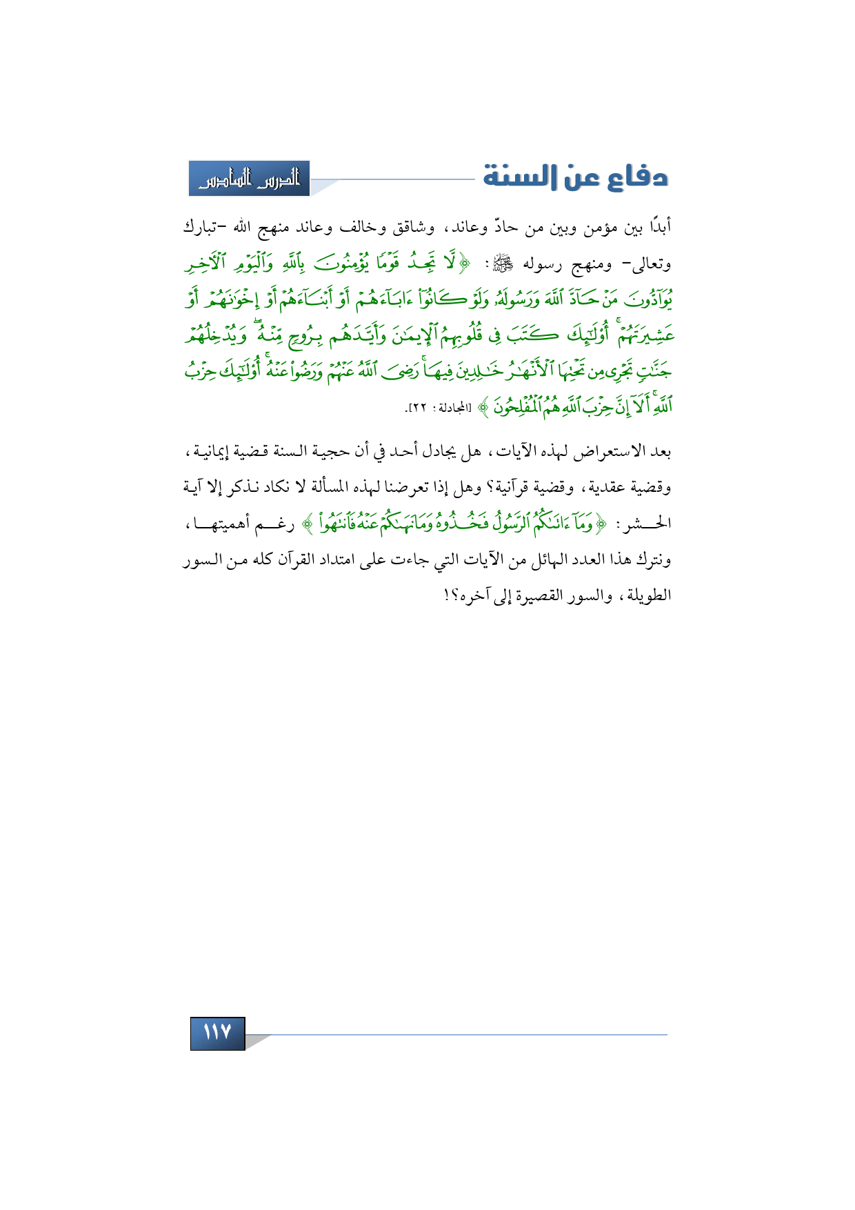 بعد الاستعراض لهذه الآيات، هل يجادل أحد في أن حجية السنة قضية إيمانية، وقضية عقدية، وقضية قرآنية؟ وهل إذا تعرضنا لهذه المسألة لا نكاد نذكر إلا آية الحشر: {وَمَا آتَاكُمُ الرَّسُولَ فَخُذُوهُ وَمَا نَهَاكُمْ عَنْهُ فَانْتَهُوا} رغم أهميتها، ونترك هذا العدد الهائل من الآيات التي جاءت على امتداد القرآن كله من السور الطويلة، والسور القصيرة إلى آخره؟!
