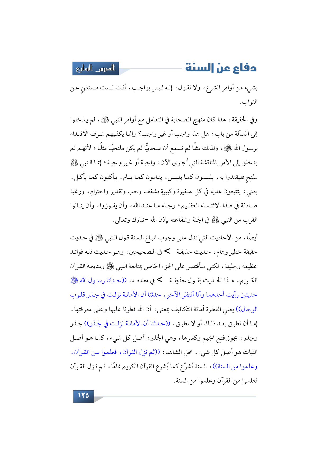أيضًا، من الأحاديث التي تدل على وجوب اتباع السنة قول النبي -صلى الله عليه وسلم- في حديث حقيقة خطير وهام، حديث حذيفة -رضي الله تبارك وتعالى عنه- في الصحيحين، وهو حديث فيه فوائد عظيمة وجليلة، لكني سأقتصر على الجزء الخاص بمتابعة النبي -صلى الله عليه وسلم- ومتابعة القرآن الكريم، هذا الحديث يقول حذيفة -رضي الله تعالى عنه- في مطلعه: ((حدثنا رسول الله -صلى الله عليه وسلم- حديثين رأيت أحدهما وأنا أنتظر الآخر، حدثنا أن الأمانة نزلت في جذر قلوب الرجال)) يعني الفطرة أمانة التكاليف بمعنى: أن الله فطرنا عليها وعلى معرفتها، إما أن نطبق بعد ذلك أو لا نطبق، ((حدثنا أن الأمانة نزلت في جَذر)) جَذر وجِذر، يجوز فتح الجيم وكسرها، وهي الجذر: أصل كل شيء، كما هو أصل النبات هو أصل كل شيء، محل الشاهد: ((ثم نزل القرآن، فعلموا من القرآن، وعلموا من السنة))، السنة تُشرّع كما يُشرع القرآن الكريم تمامًا، ثم نزل القرآن فعلموا من القرآن وعلموا من السنة.