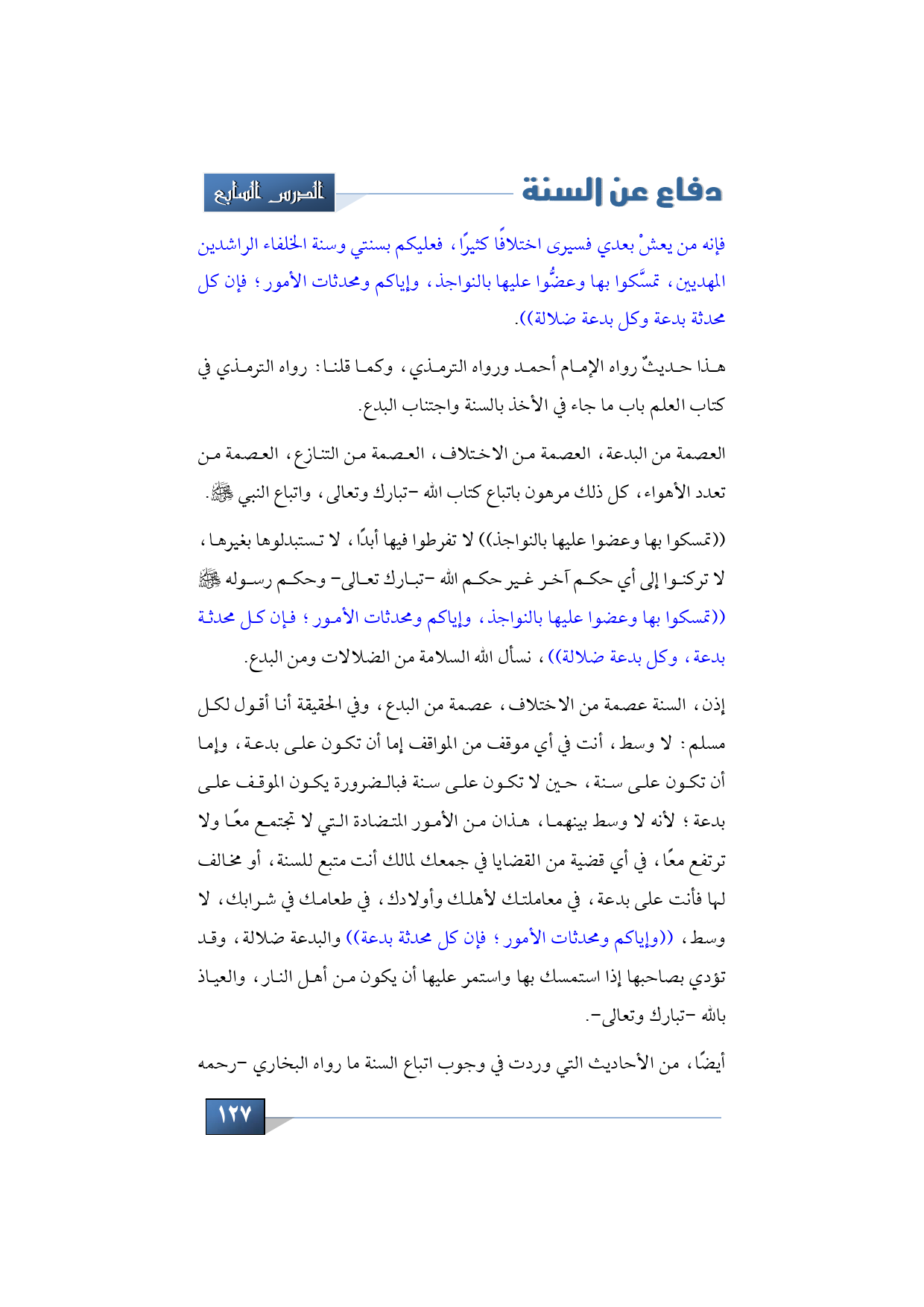 فإنه من يعشْ بعدي فسيرى اختلافًا كثيرًا، فعليكم بسنتي وسنة الخلفاء الراشدين المهديين، تمسَّكوا بها وعضُّوا عليها بالنواجذ، وإياكم ومحدثات الأمور؛ فإن كل محدثة بدعة وكل بدعة ضلالة)).